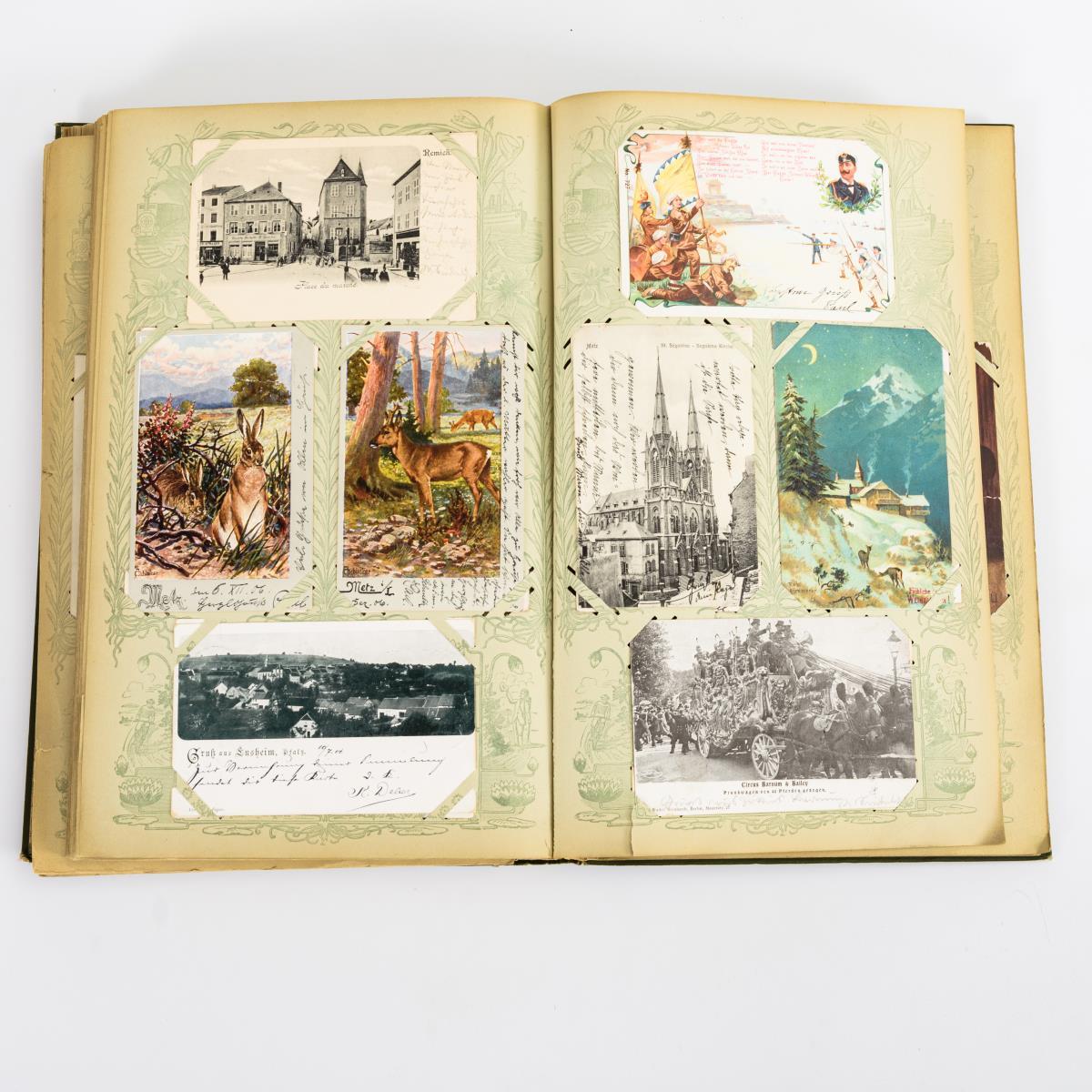Ca. 388 Karten, darunter viele "Gruß aus ...", auch Elsaß, Saargebiet. Auch "Gruß aus Dar-es-Salaam, Deutsch-Ost-Afrika". Dunkelgrünes "Postkarten-Album" mit Lilien.