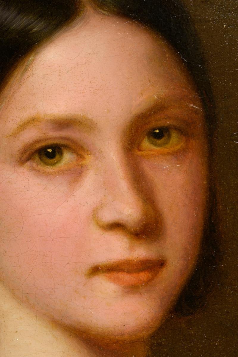 Porträt einer jungen Frau mit dunklem Haar im weißen Kleid. Leichte Altersspuren.