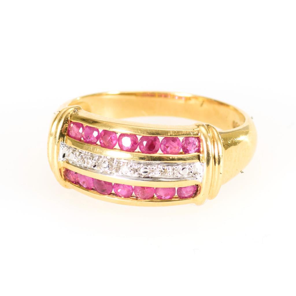 Mittlerer Reif mit 3 kleinen, eingelassenen Diamanten und 14 Rubinen.