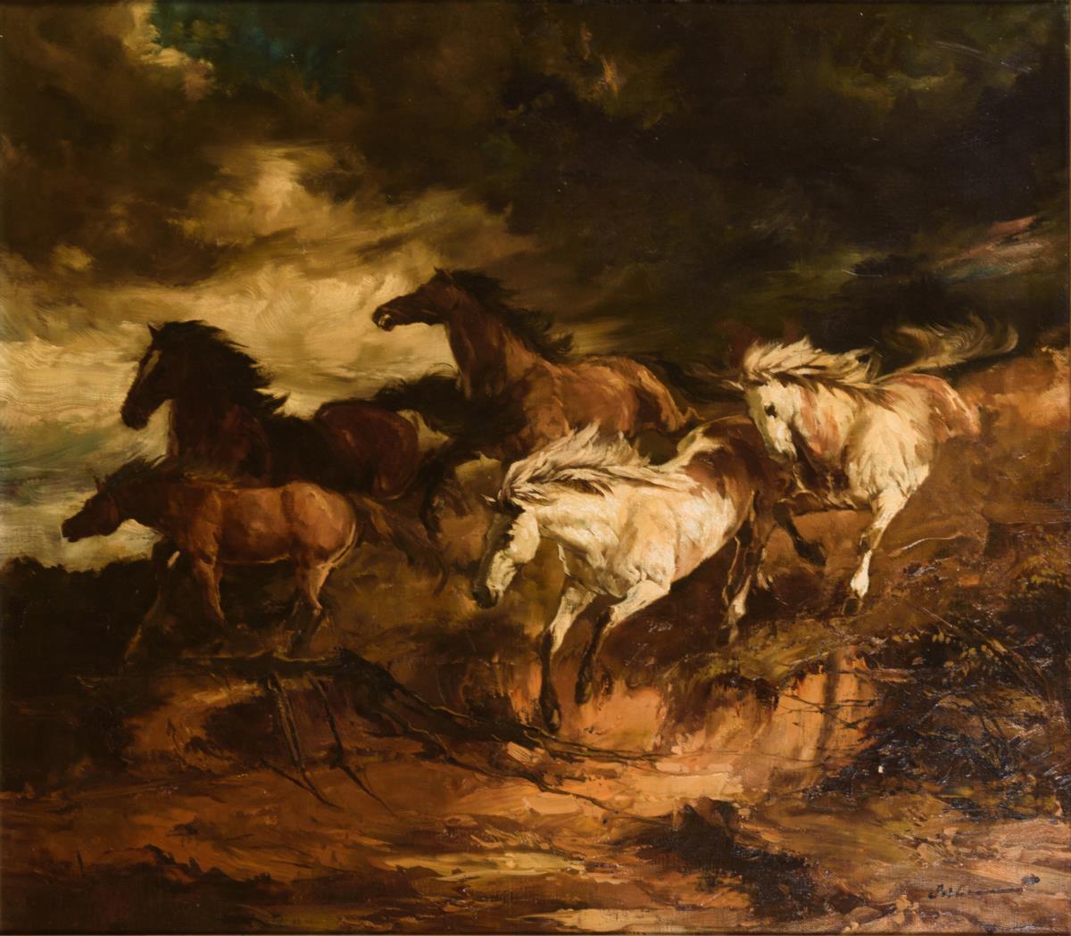 Die Wildpferde im eiligen Galopp unter dunklen Sturmwolken. Minimale Altersspuren.