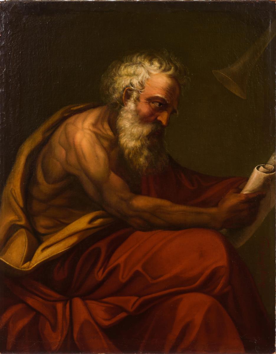 Alter Mann in rotem antikisierenden Gewand mit Schriftrolle. Leinwand doubliert.