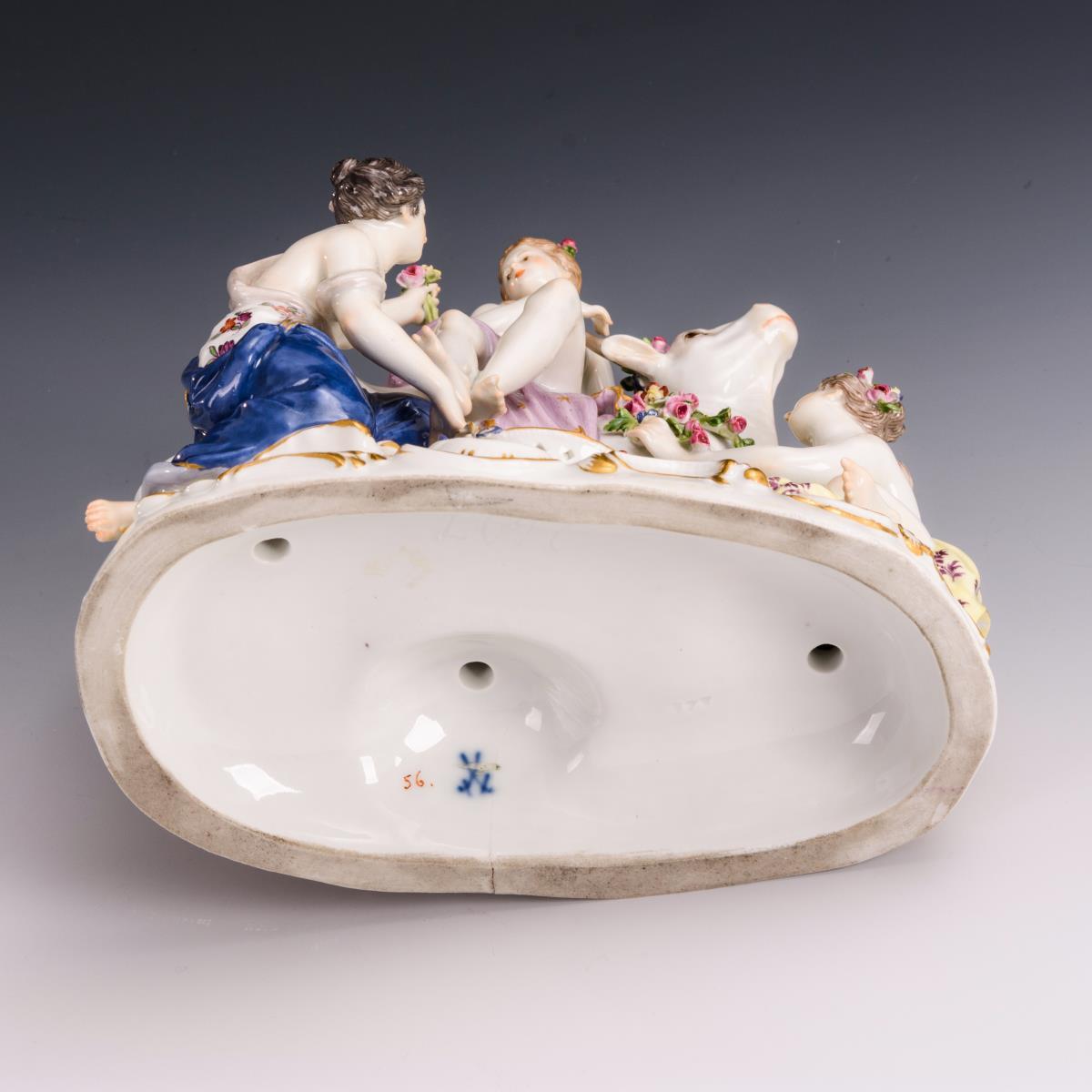 Dreifigurige Gruppe mit der auf einem blütengeschmückten Stier sitzenden Europa sowie zwei vor dem Stier sitzenden Nymphen. 1 Korbhenkel restauriert, vereinzelt Bestoßungen an Blüten und Blättern, 1 Zeh bestoßen, verso Brandriss am Sockelrand.