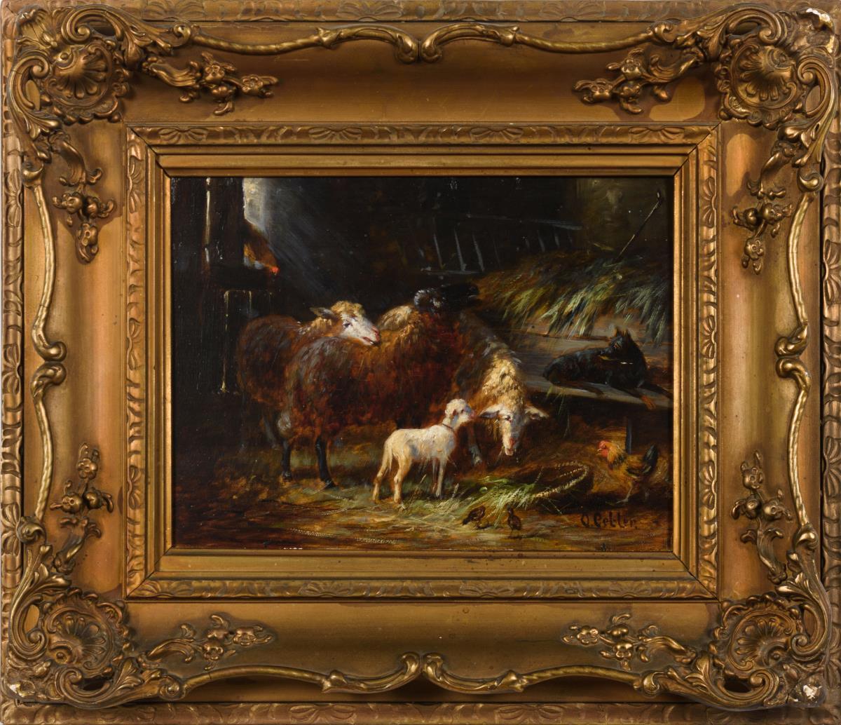Die Tiere mit dem Geflügel und dem Hund im Stall bei einfallendem Sonnenlicht. Minimale Altersspuren.