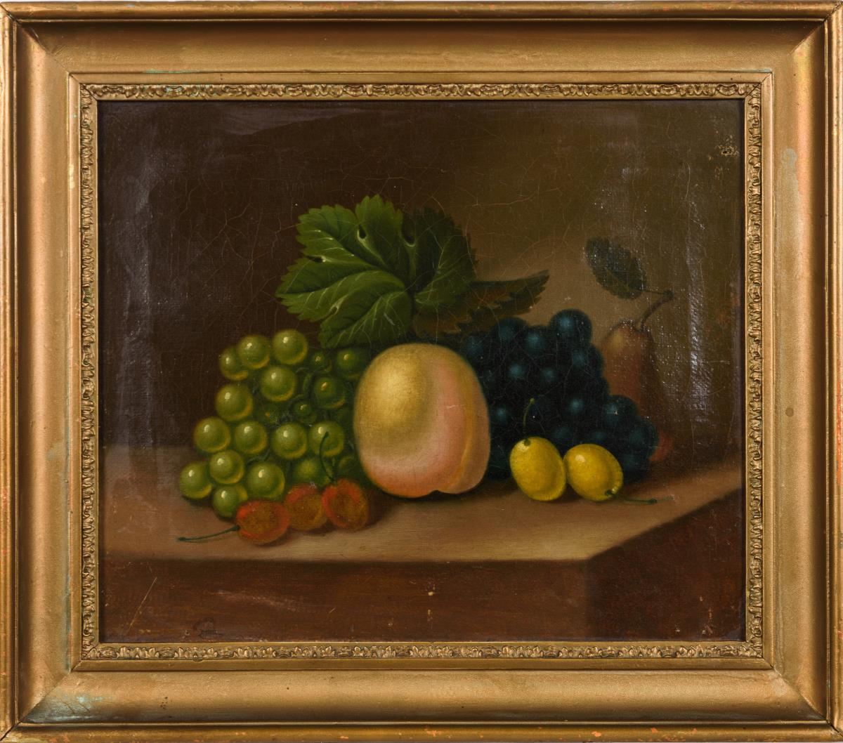Trauben neben Pfirsich, Birne und Kirschen. Ein kleiner Defekt.
