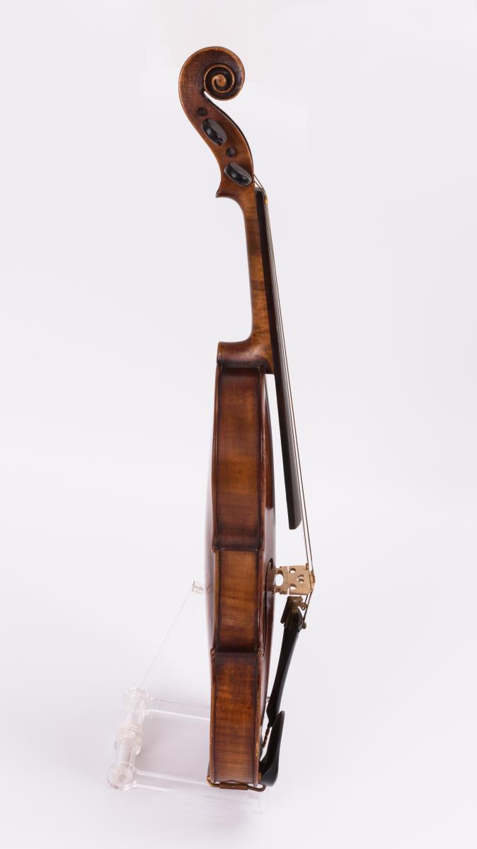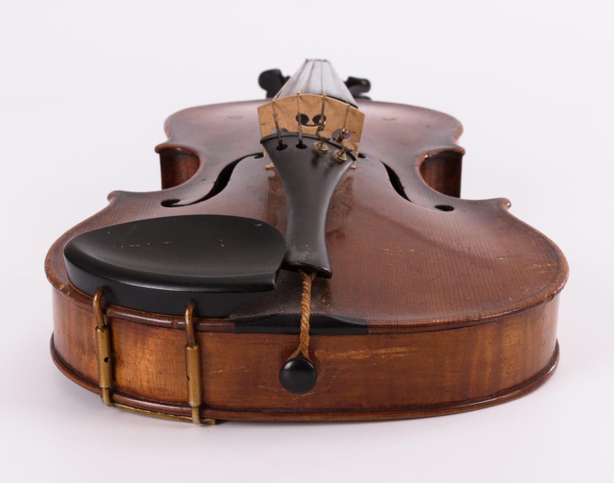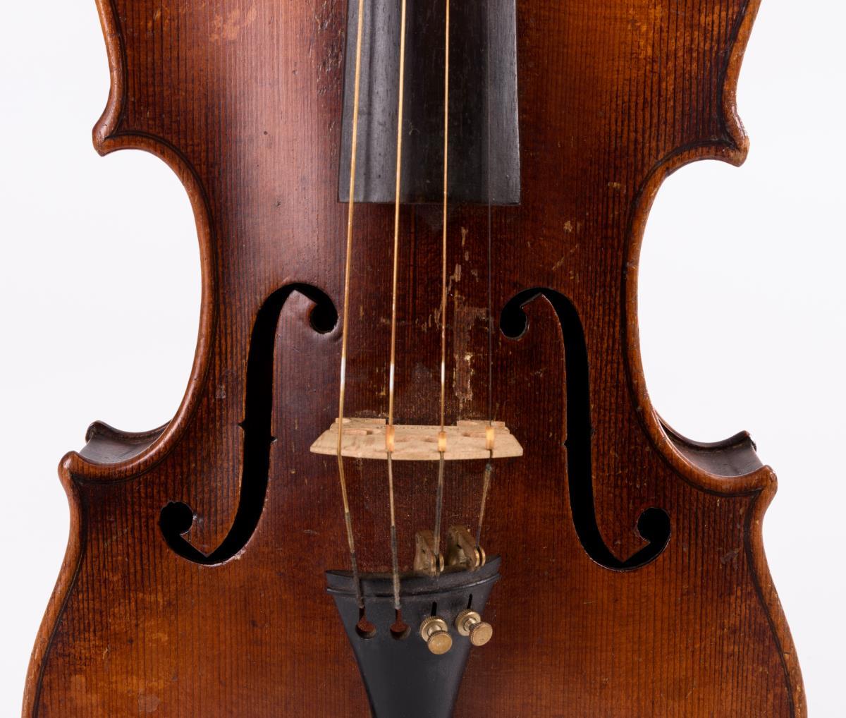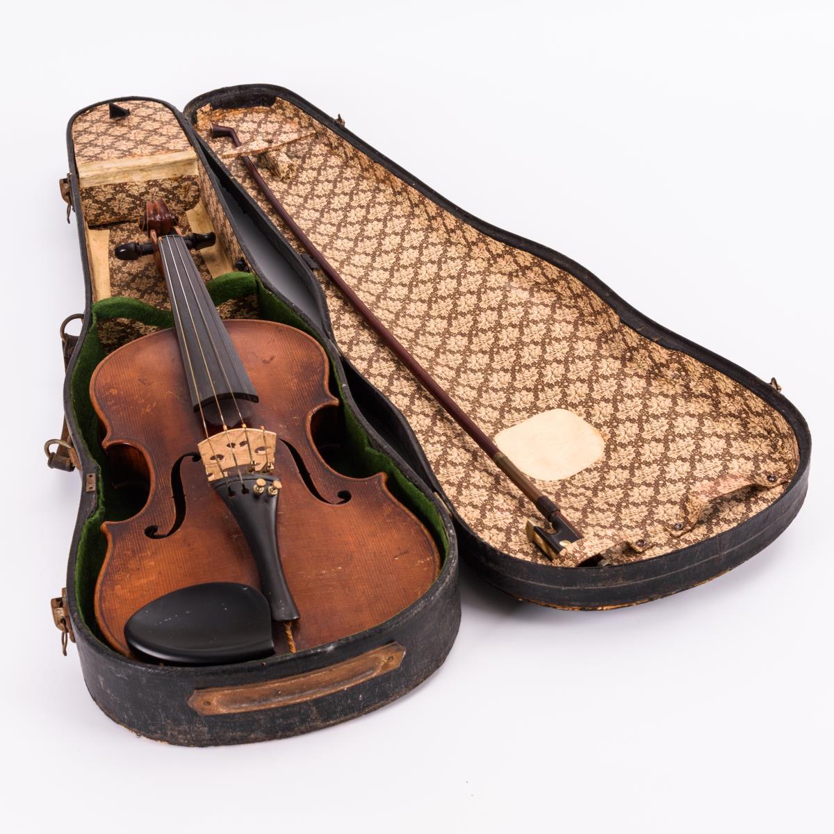 Violine mit geteiltem Boden und geteilter Decke; Kinnschutz. Gemarkter Bogen mit Kupferwicklung. Schwarzer Kasten. Zarge teils gelöst, Bespannung Bogen fehlt, je starke Alters-/Gebrauchsspuren.