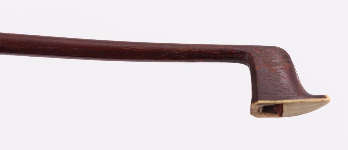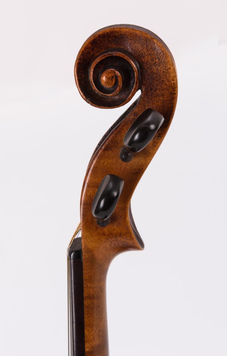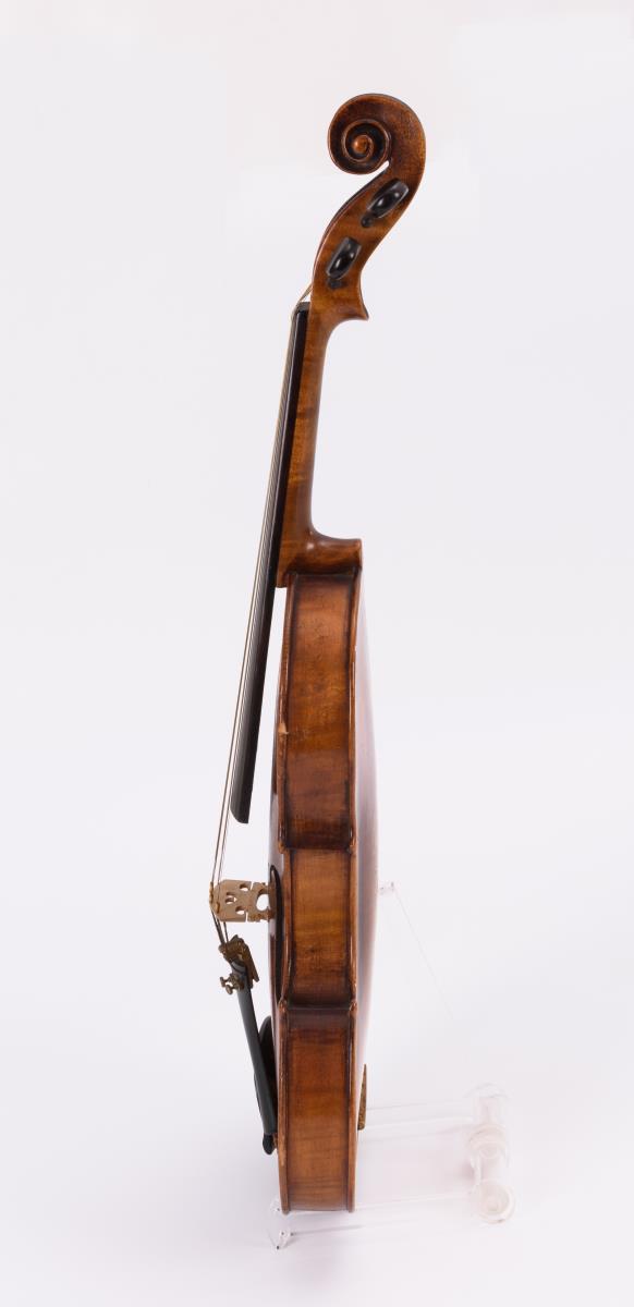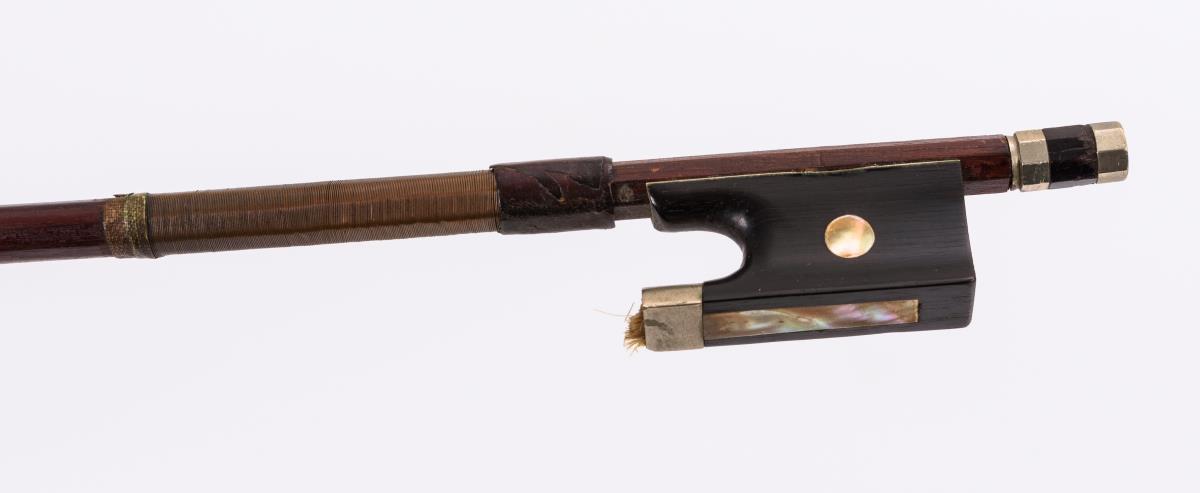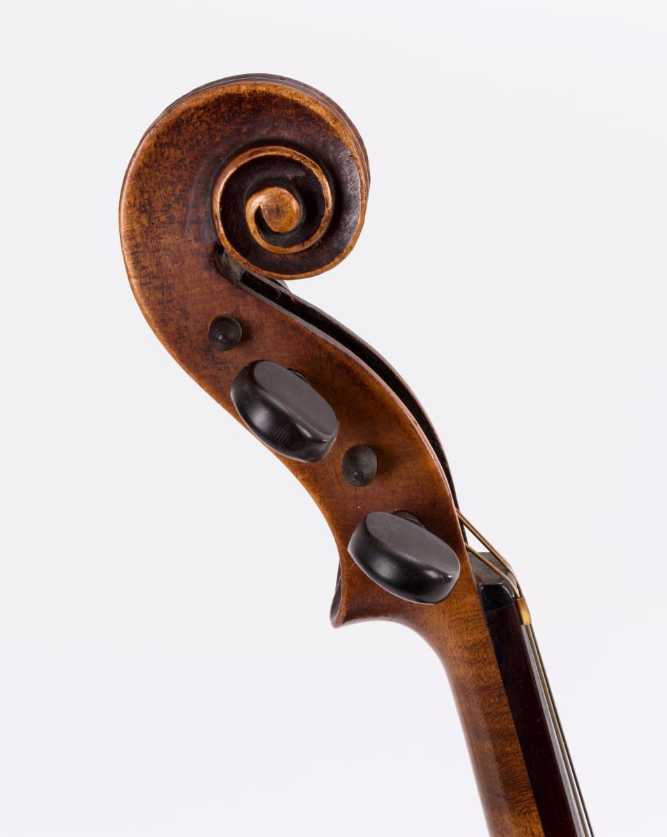 Violine mit geteiltem Boden und geteilter Decke; Kinnschutz. Gemarkter Bogen mit Kupferwicklung. Schwarzer Kasten. Zarge teils gelöst, Bespannung Bogen fehlt, je starke Alters-/Gebrauchsspuren.