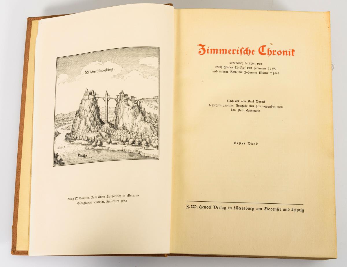 "..., Urkundlich berichtet von Graf Froben Christof von Zimmern ... und seinem Schreiber Johannes Müller ...." Nach der von Karl Barack besorgten zweiten Ausgabe [von 1882] neu herausgegeben von Paul Herrmann. Band 1: Wildenstein Vestung, Burg Wildenstein, Band 2: Burg Hohenzollern, Band 3: Gottfried Wernher von Zimmern, Band 4: Burg Hohentwiel. Schwache Altersspuren.
