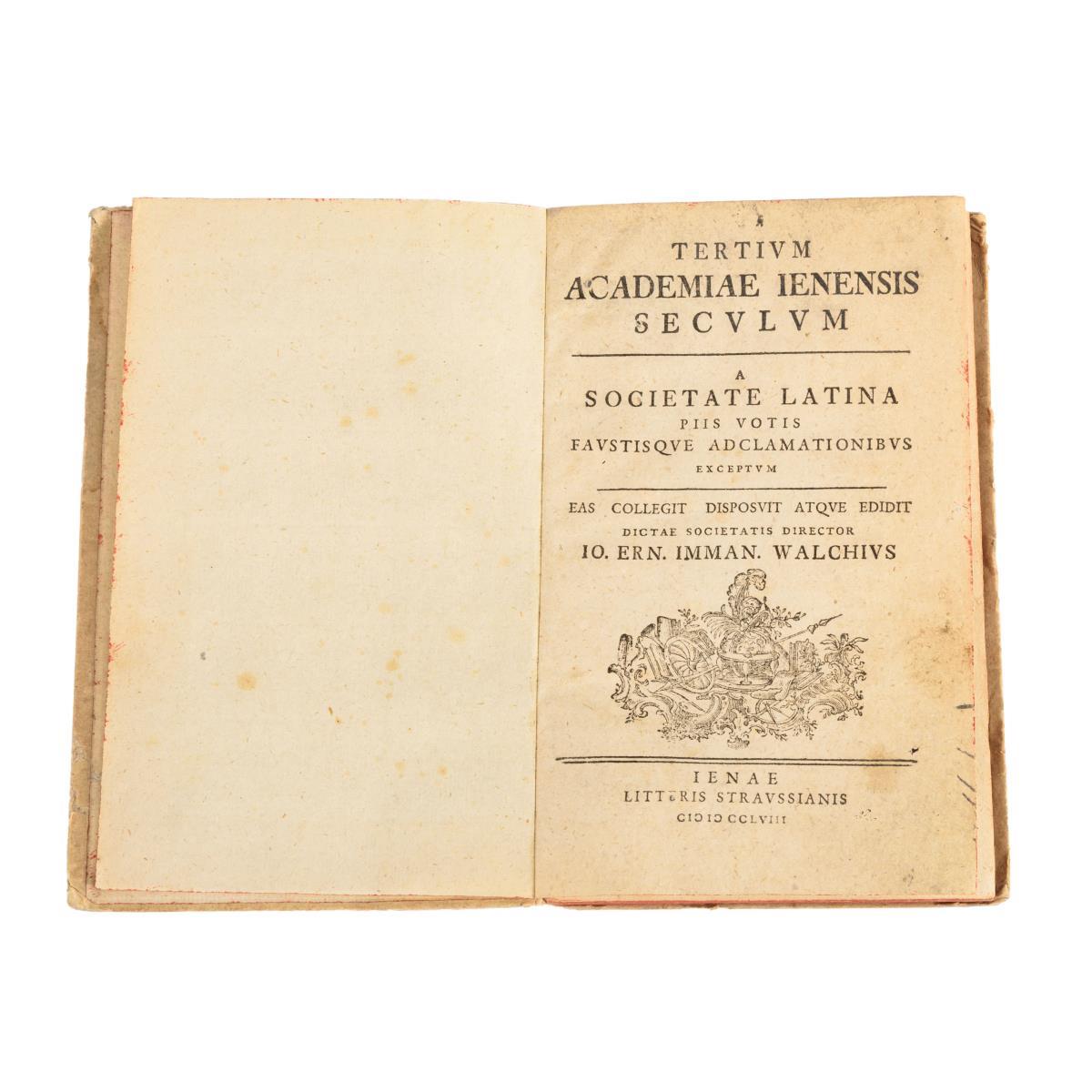"A Societate Latina piis votis faustique adclamationibus exceptum". Litteris Straussianis. Jenae (Jena). 1758. 19 x 12 cm.