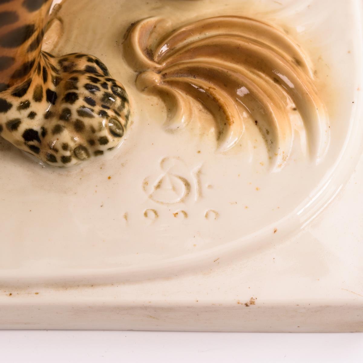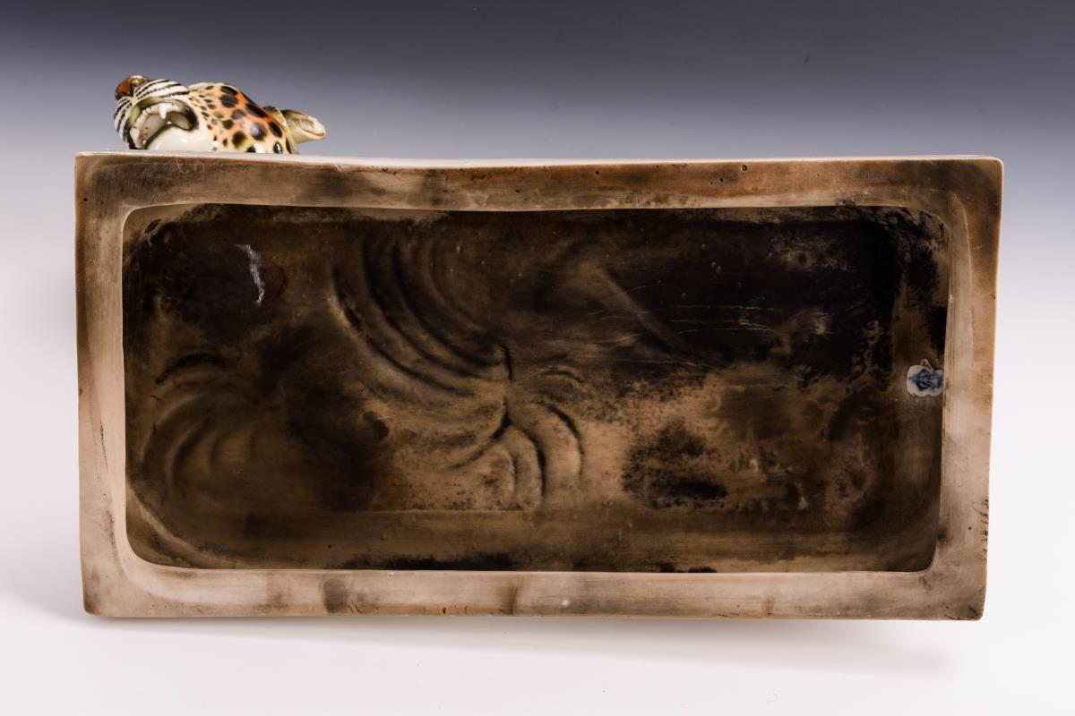 1 Ohr bestoßen, partiell herstellungsbedingte Glasurfehler an den schwarzen Punkten, unterseitig etwas geschwärzt.