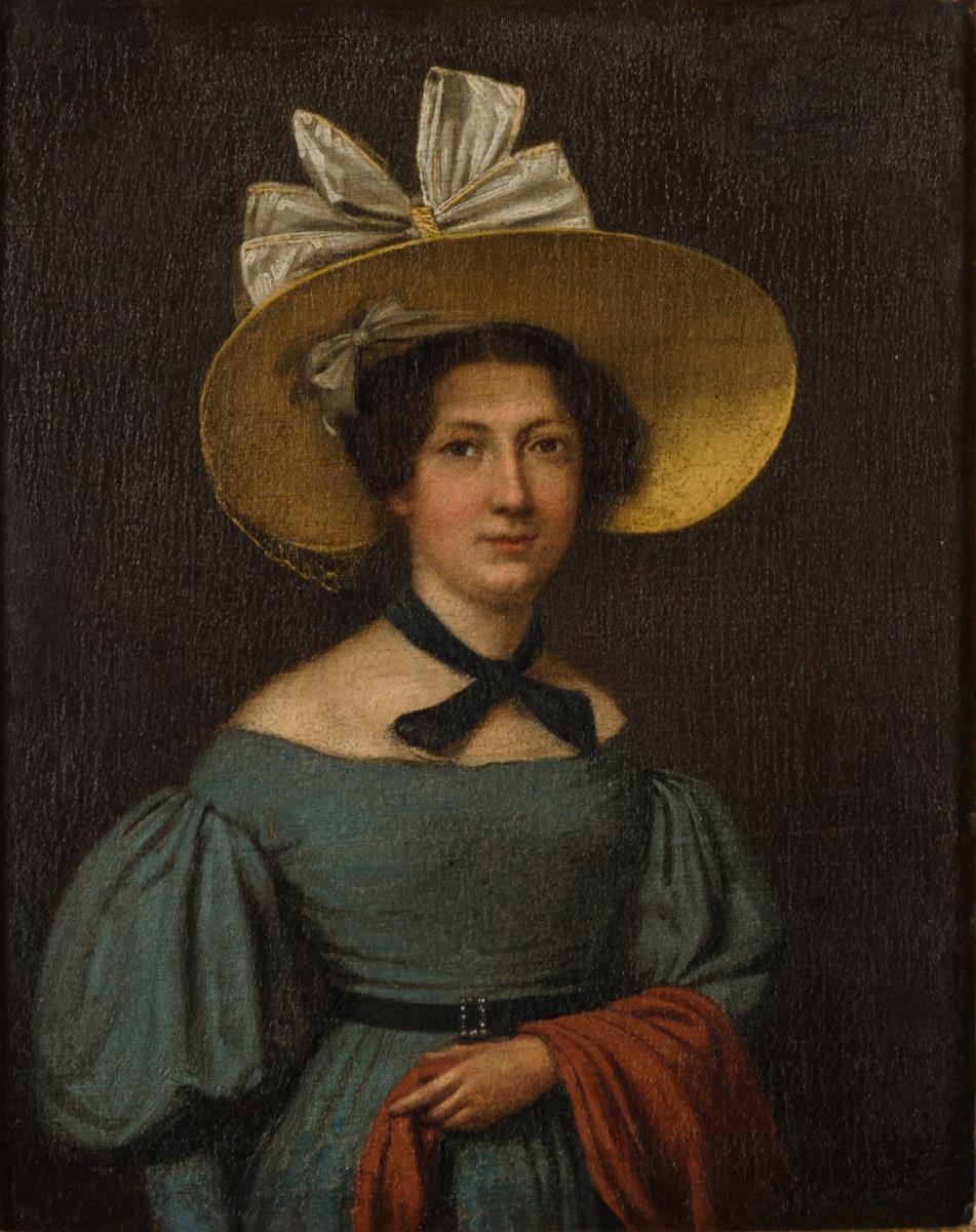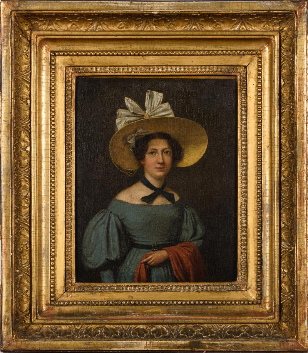 Porträt einer jungen Frau im blauen Kleid mit breitkrempigem Hut. Leinwand doubliert.