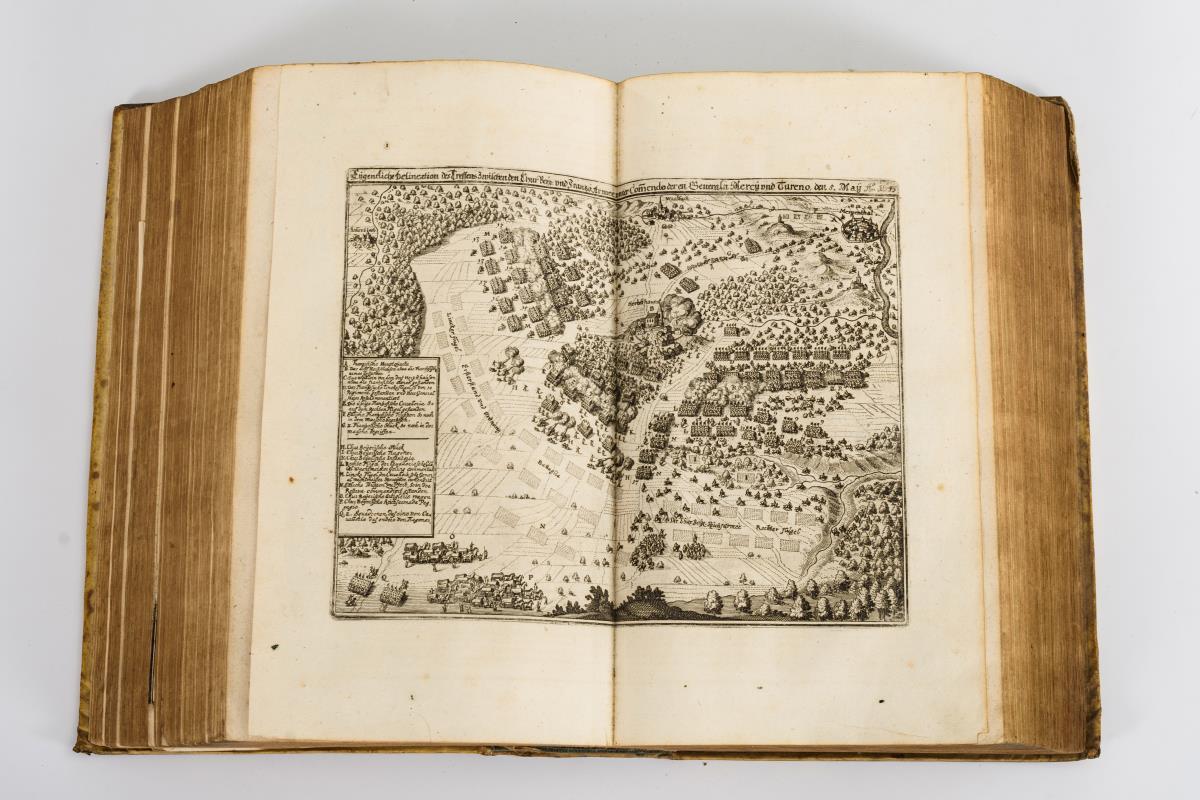Titelkupfer, Titelblatt, (8), 1349, (17) Seiten. Faltblatt: Fluß Poo, stark eingerissen und einige Falten / Plan von Hornhausen mit Heilbrunnen, sowie 55 zweiseitige und 2 einseitige Kupferstiche und zahlreiche Seitenillustrationen, hauptsächlich Porträts. Pergamenteinband. Guter, altersgemäßer Zustand. 5 Blindblätter im Vorsatz mit wenig Wurmfraß.
