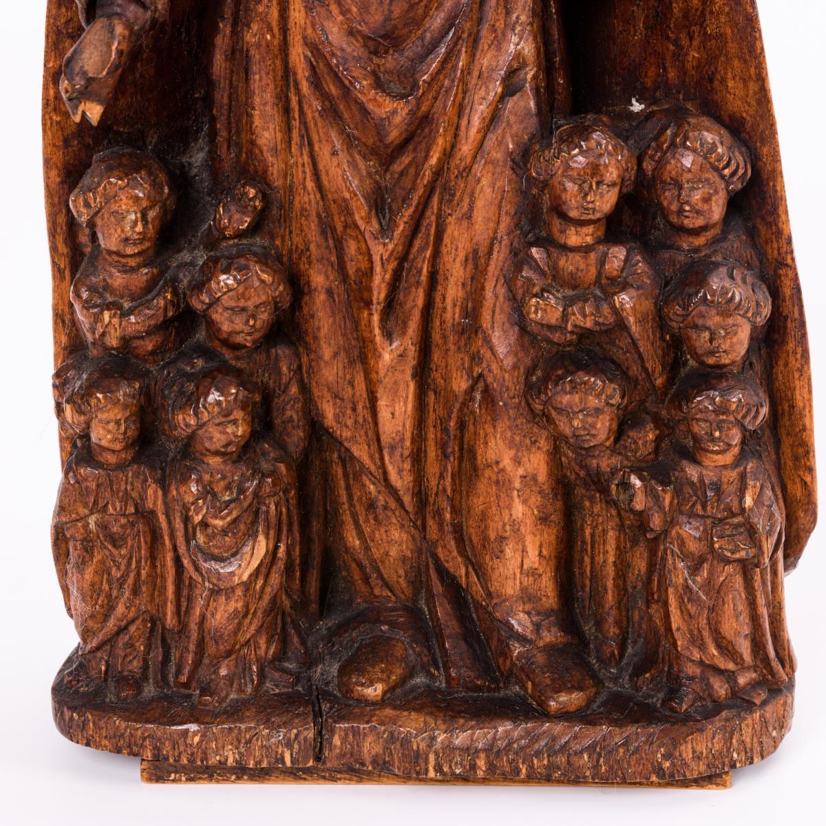 Stehende Maria mit Buch und zahlreichen Figuren unter dem ausgebreiteten Mantel. Beide Arme geklebt, kleinere Fehlstellen, Anobienspuren, etwas haarrissig.