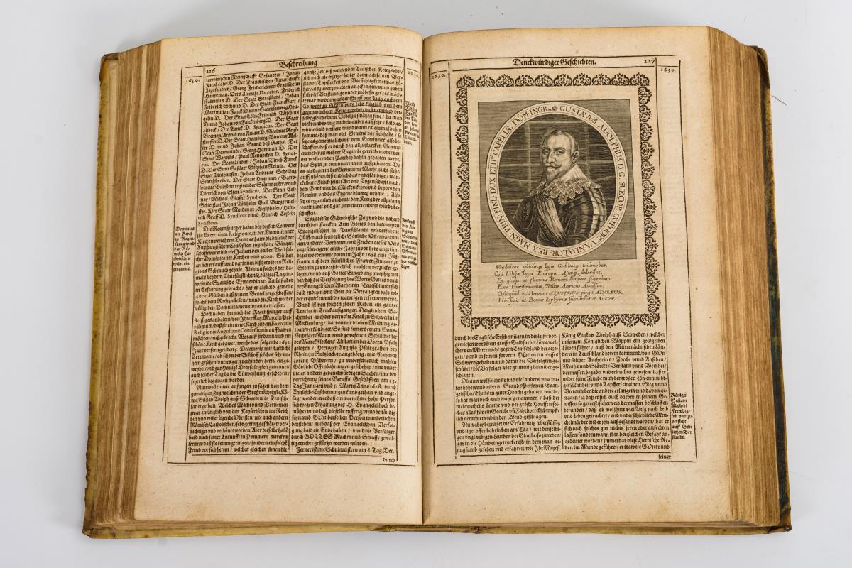 Titelkupfer, Titelblatt, (4), 778, (20) Seiten. Kupferstichfaltblätter: Karte der Elbe (Albis) / Schlachtplan vom September 1631 / Schlachtplan vom November 1632, weiterhin 36 doppelseitige und zwei einseitige Kupferstiche sowie zahlreiche Textillustrationen. Im Vorsatzpapier Wasserzeichen "Waldenburck" um Blüte. Pergamenteinband. Guter Erhaltungszustand mit altersgemäßen Gebrauchsspuren.