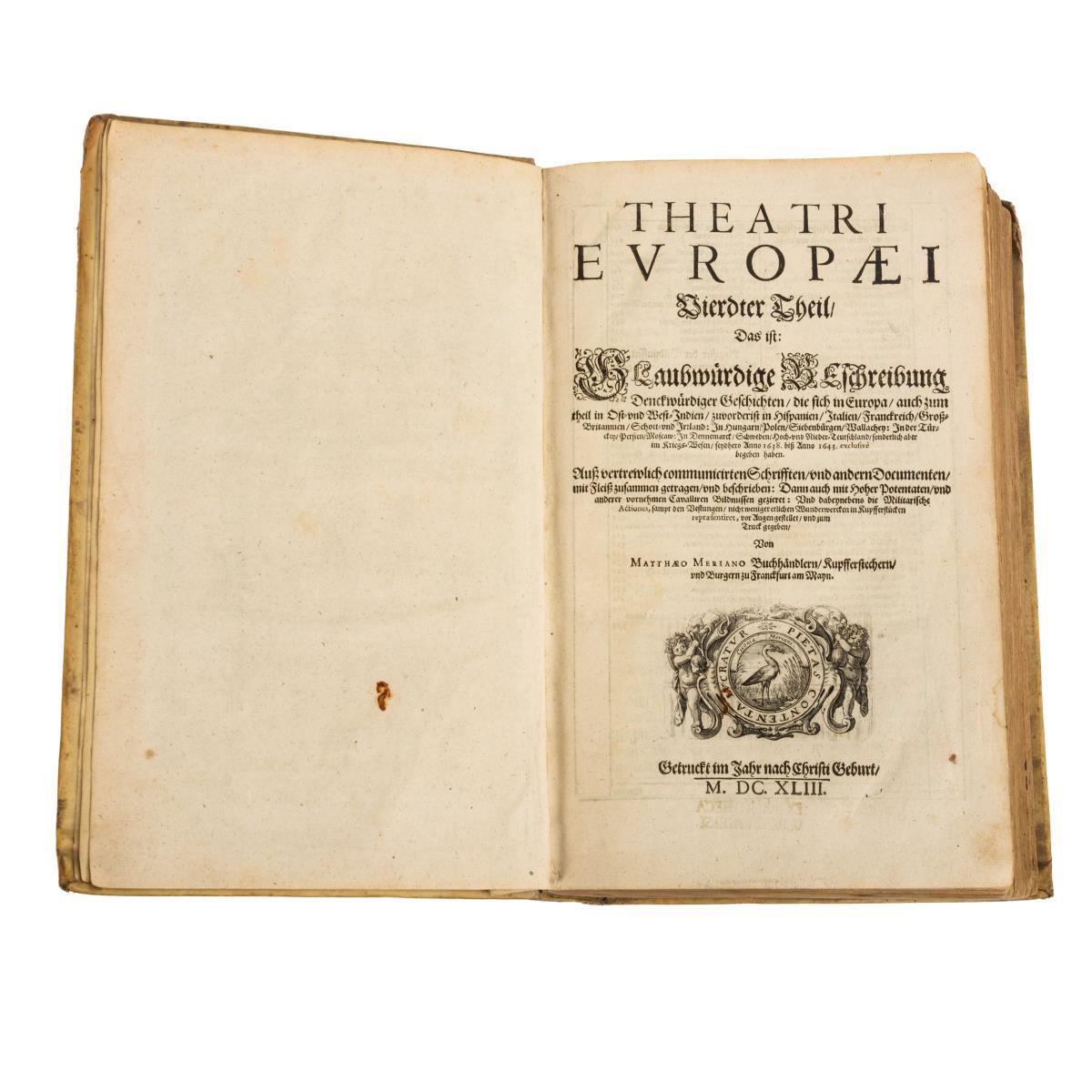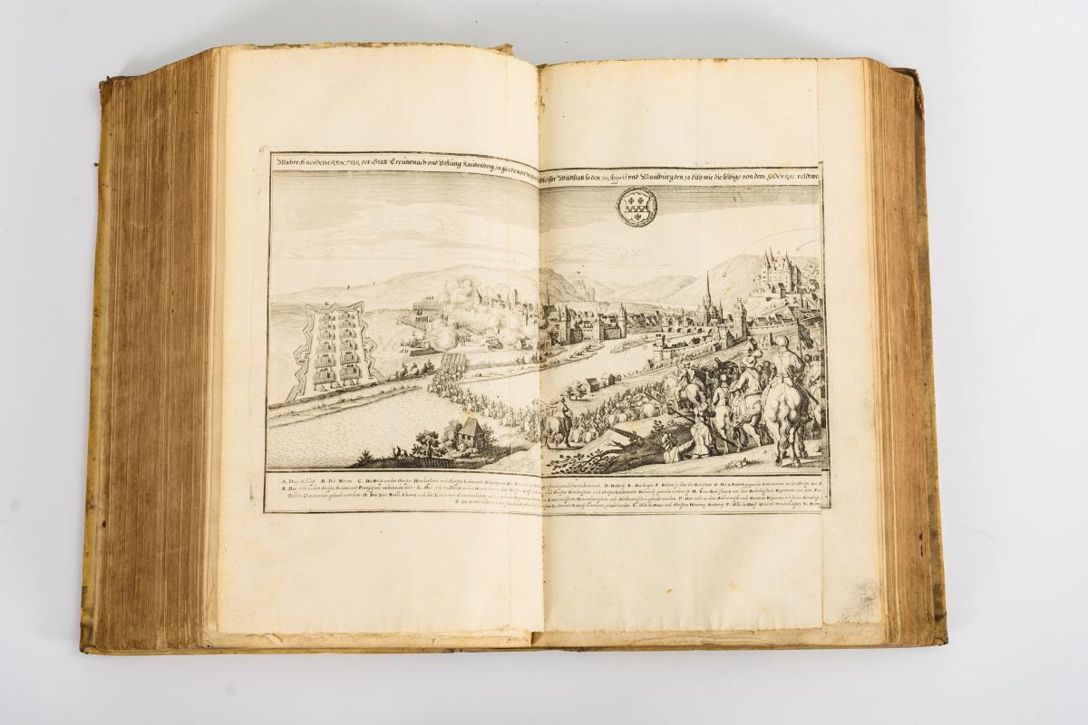 Titelkupfer, Titelblatt, (4), 978 (20) Seiten. Faltblatt: Seeschlacht Duynen / Statt Creutzenach / Belagerung Wolfenbüttel. Dazu 45 zweiseitige und ein einseitiger Kupferstich. Wenige Porträtillustrationen im Text. Pergamenteinband. Wasserzeichen im Vorsatzpapier: "Woldenberck" als Umschrift um Blüte. Altersgemäßer, guter Zustand.