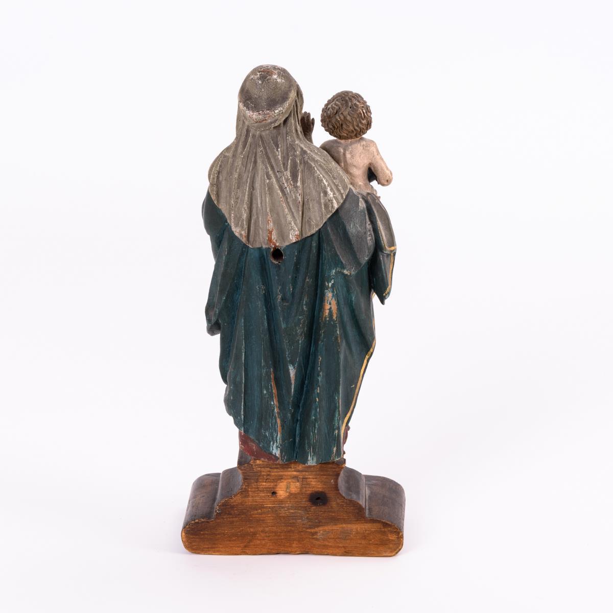Das Jesuskind mit der Weltkugel auf dem Arm der Maria; geschweifter Holzlockel. 1 Fuß Jesu und Attribut Mariae fehlen, einige wenige Alters-/Gebrauchsspuren.