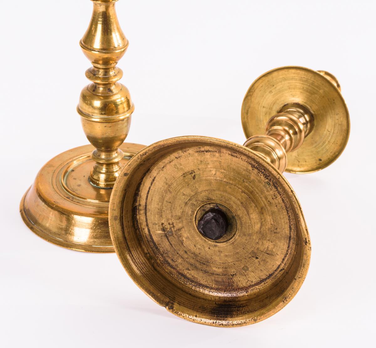 Massive Bronzeleuchter mit Balusterschaft und Tropftellern ähnlich wie bei Kragenleuchtern. Wenige Lötspuren, einige Wandungslöcher, Alters-/Gebrauchsspuren.