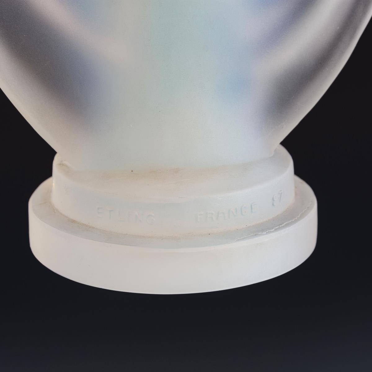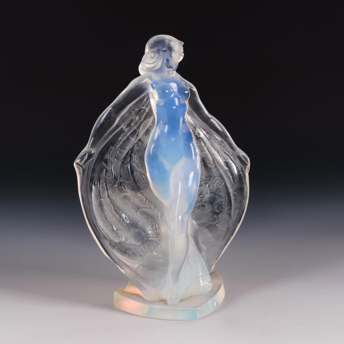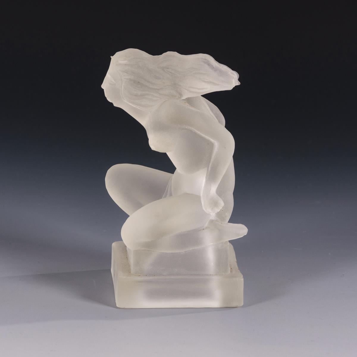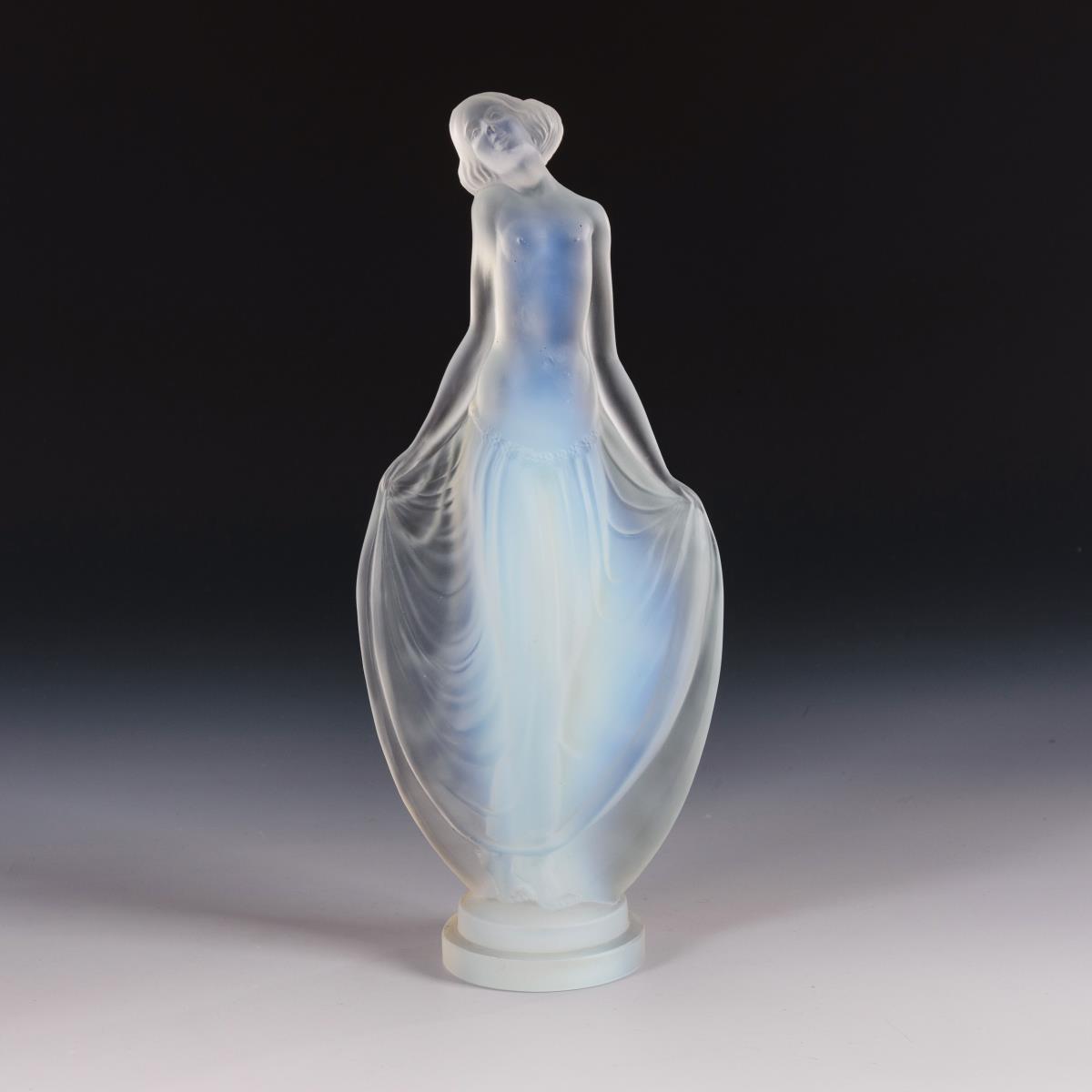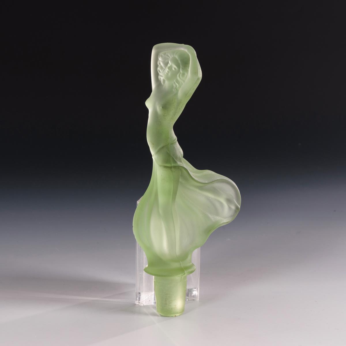 1x Ernest Sabino, gemarkt, Opalglas: Tänzerin mit Umhang (H 23,5 cm). / 1x Edmont-Laurent Etling, gemarkt, Opalglas: orientalische Tänzerin (Entwurf Lucille Sevin; H 27 cm). / 2x ungemarkt: hockender Akt aus farblosem Glas (H 12 cm) und orientalische Tänzerin als Flakonstopfen aus grünem Glas (H 20 cm).