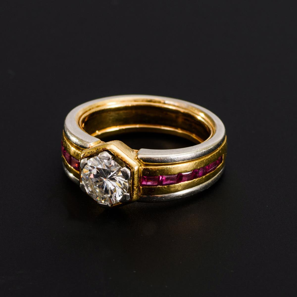Massiver Ring mit krappengefasstem Brillant und 12 eingelassenen Rubincarrés. Brillant mit
