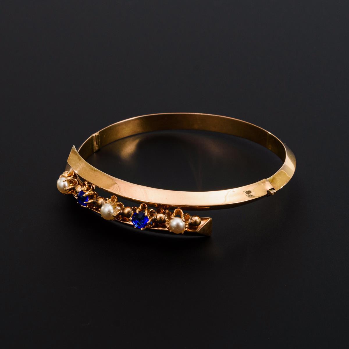 Armreif mit Kunstperlchen und 2 blauen Imitationen.