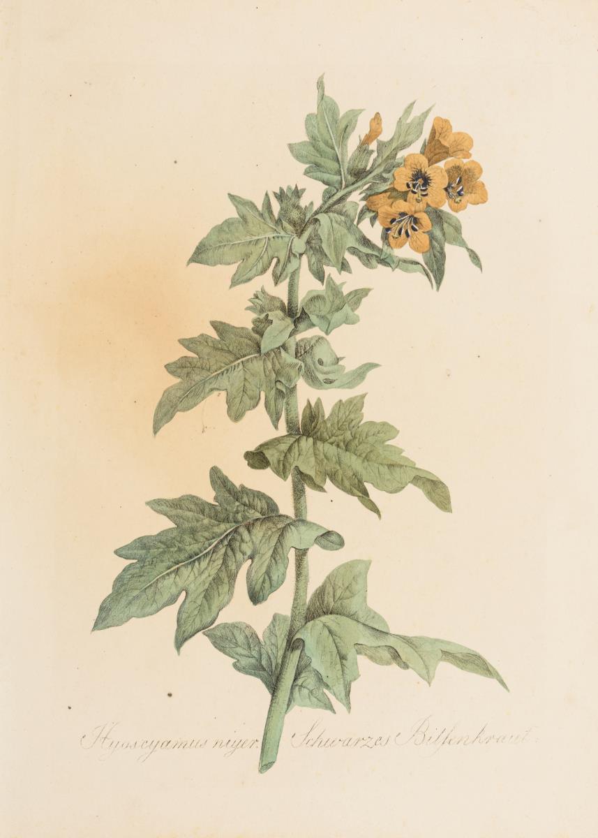 13 botanische Studien mit Bezeichnung in Latein und Deutsch: "Pelargonium Zonale - Gemeiner Storchschnabel", "Atropa Belladonna - Gemeine Wolfskirsche", "Asarum Europaeum - Europäische Haselwurz", "Daphne Mezereum - Gemeiner Kellerhals", "Hyoscyamus neyer - Schwarzes Bilsenkraut", "Lilium Martagon - Türkische Bundlilie", "Paeonie officinalis - Gemeine Pfingstrose", "Hypericum monogynum - Einweibige Johannis-Staude", "Tulipa striata - Gestreifte Tulpe", "Aconitum Napellus - Gemeiner Sturmhut", "Digitalis purpurea - Purpurrother Fingerhut", "Scabiosa atropurpurea - Dunkelpurpurne Scabiose", "Passiflora caerulea - Blaue Passionsblume". Teils mit Stockflecken und Lichtschaden.