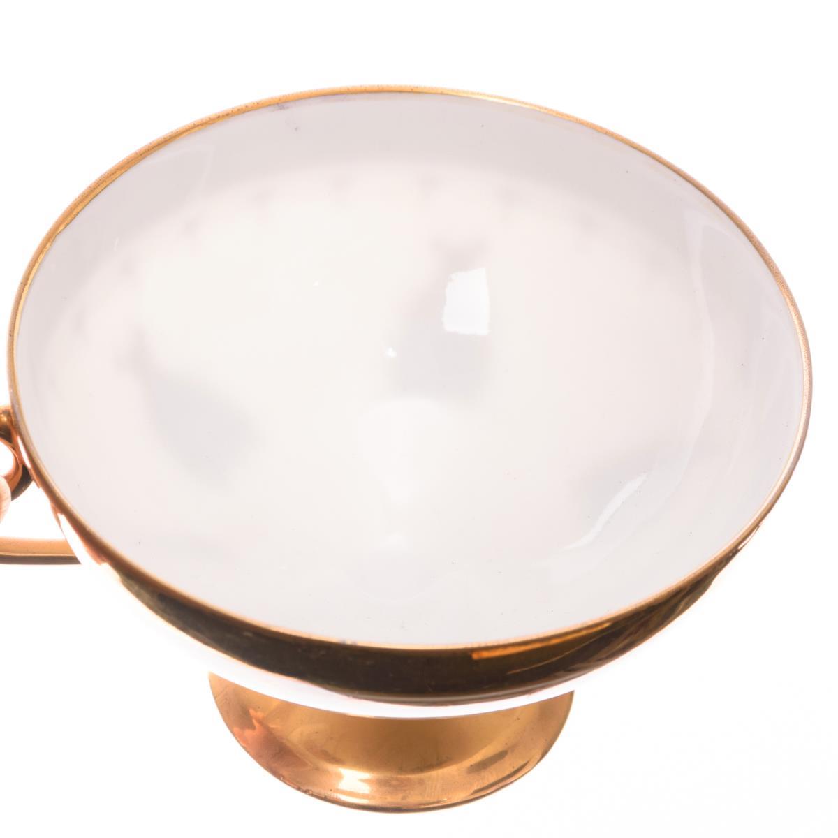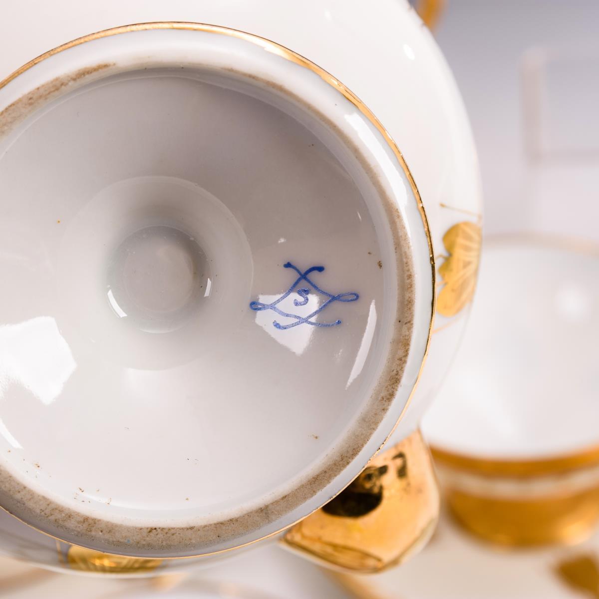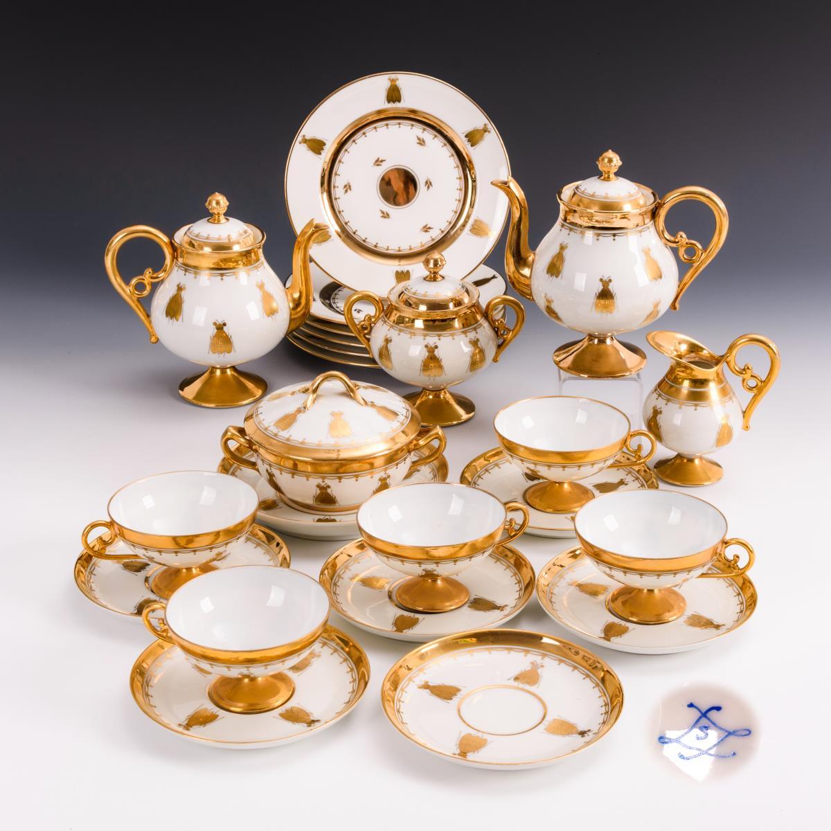 23 Teile. 2 Teekannen (H 17 cm), Milchkännchen, Zuckerdose, 5 Teetassen mit 6 Untertassen, 6 Frühstücksteller, 1 Deckelschale mit Unterteller. Minimaler Goldabrieb.