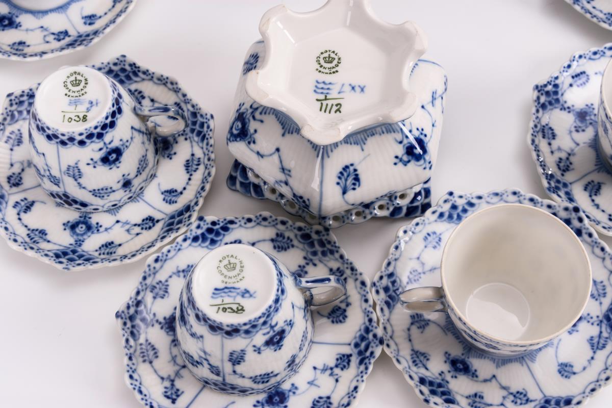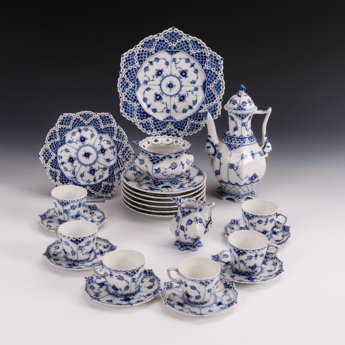 23 Teile. Form "Musselmalet Vollspitze". Mokkakanne (H 20,5 cm), Milchkännchen, Zuckerschale, 6 Mokkatassen, 6 Untertassen, 6 Gebäckteller und 2 Kredenzteller (Ø 17,5 und 21 cm).