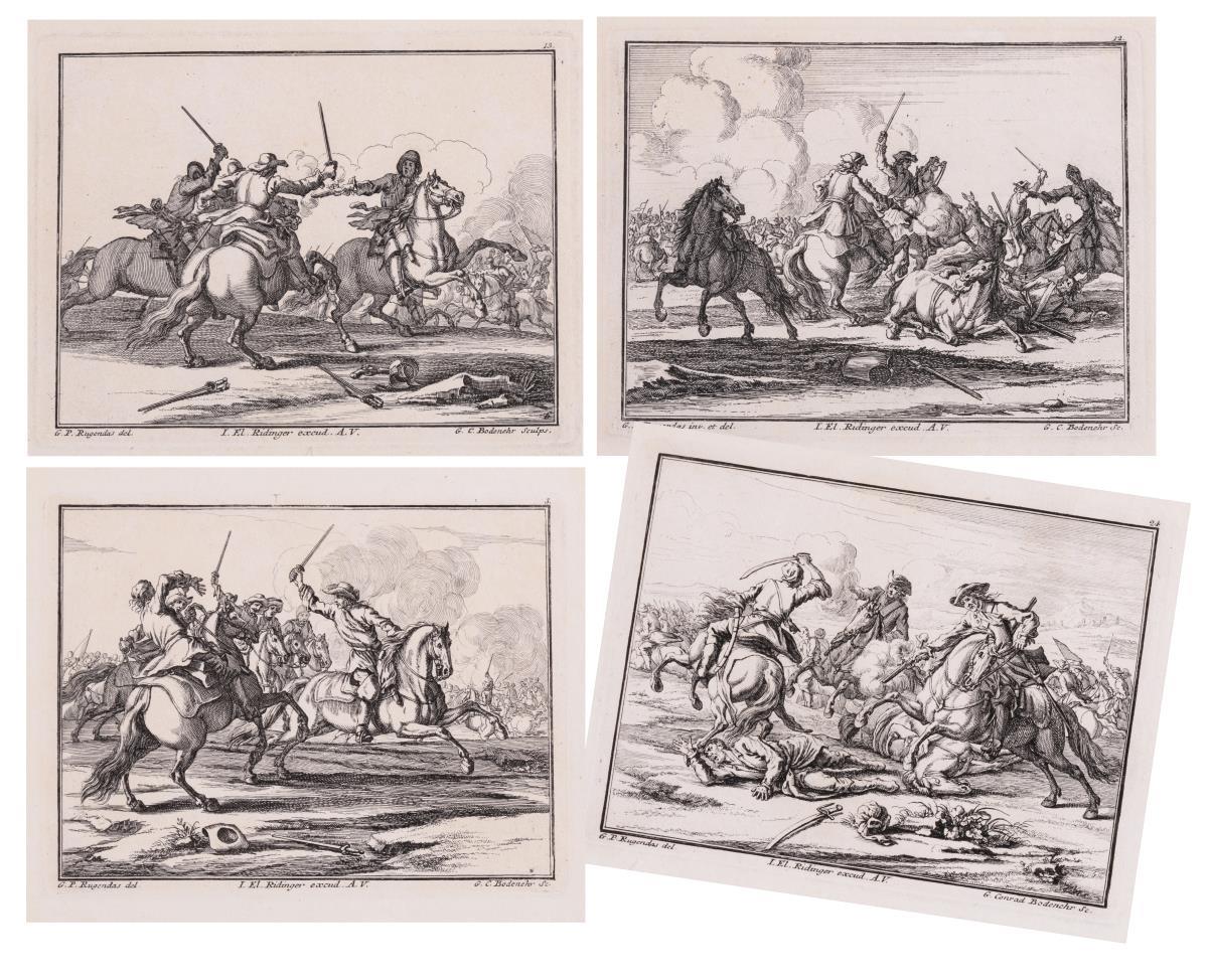 Blatt 10/11 aus der Folge A: "Kampf zwischen zwei Säbelkämpfern gegen zwei Reiter mit Pistolen", Blatt 6/8 aus der Folge B: "Gefecht von vier Reitern", Blatt 8/8 aus der Folge B: "Gefecht zwischen einem Einzelnen und einer Gruppe Anreitender" sowie Blatt 6/8 aus der Folge D "Reiterkampf"; bezeichnet mit Namenszügen der Künstler "G.P. Rugendas inv. et del., "G.C. Bodenehr Sc." und "I. El. Ridinger excud. A.V". Minimal verschmutzt.