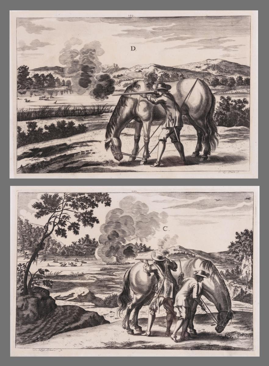 Nr. 101 und Nr. 102 der Folge "Darstellung von Pferden in freier Landschaft für Jagd/Krieg schussfest zu machen" aus G.S. Winter "Wohlberittener Cavallier". Etwas verschmutzt, Blatt je beschnitten.