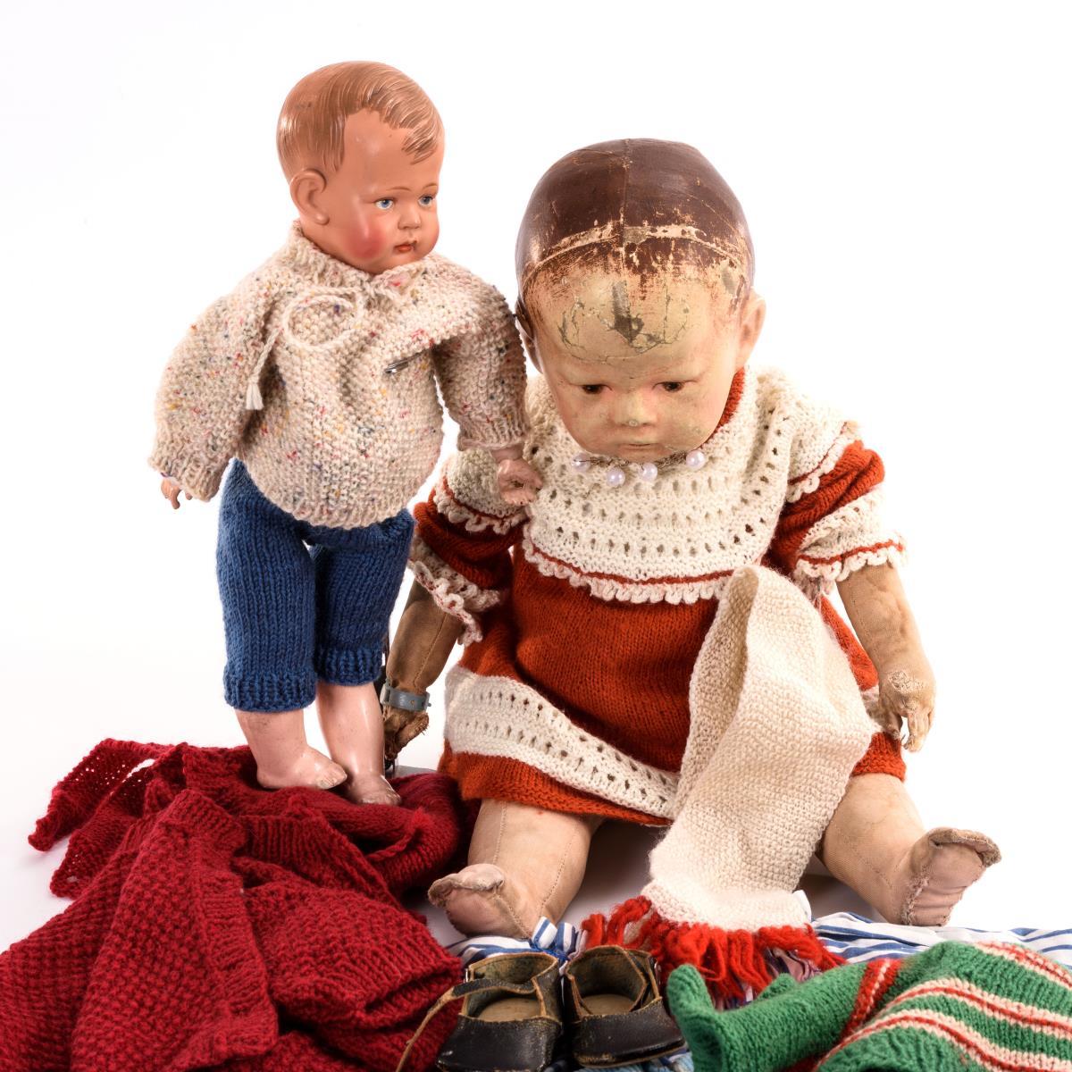 Defekte Käthe-Kruse-Puppe Typ I mit 3 Hinterkopfnähten, maskenartiger Gesichtsbemalung, einzeln angenähten Daumen, breiten Hüften und 5 Beinnähten. Bemalung stark berieben, Körper fleckig, mit Defekten und alten Reparaturen. Weiß-rotes Strickkleid. / Kleiner Junge mit Celluloidkopf und 15-teiligem Gliederkörper. Mit Defekten. In Strickkleidung. / Dazu ca. 7 Teile Puppenkleidung.