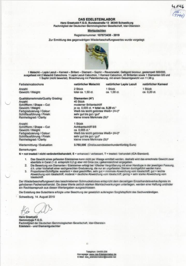 Halbplastischer Vogel, besetzt mit 40 Brillanten, 1 Saphir und Steinsegmenten Karneol, Malachit und Lapis. Kugelhaken .