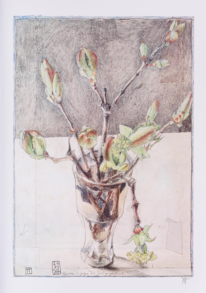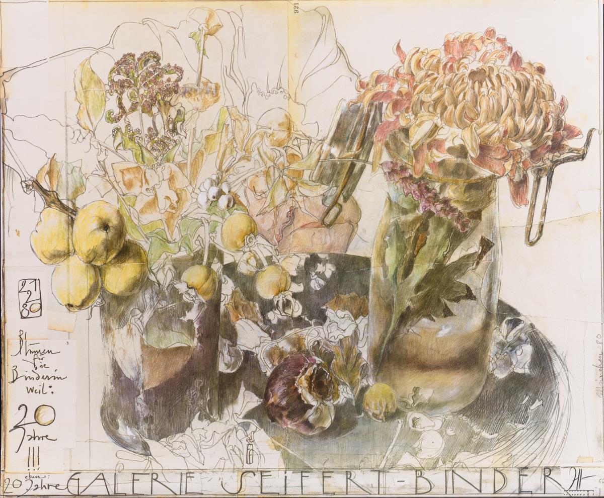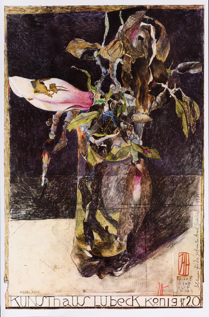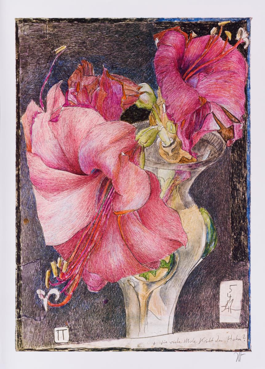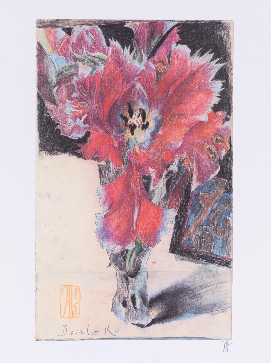 "Gestern verdauen - morgen fangen"; "Wie viele Male kräht der Hahn?"; "Ahorn - gegen die Zeit gezeichnet" (verso: blauer Mohn); "Marija Rajewski´s bezauberne Füsschen"; "Basel-Rot"; "Ich bestaune den Himmel [...]"; "Arkana Verlag"; "Liebe Christiane [...]"; "Kunsthaus Lübeck: "Blumen für die gefirmte arme Gaulin" und "Galerie Seifert-Binder: "Blumen für die Binderin weil: 20 Jahre!!!".