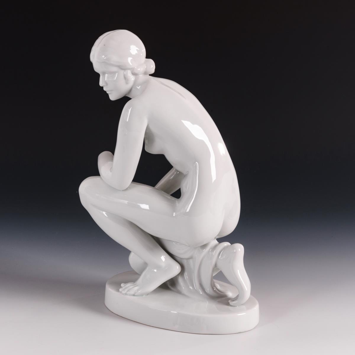 Hockender Akt einer jungen Frau.