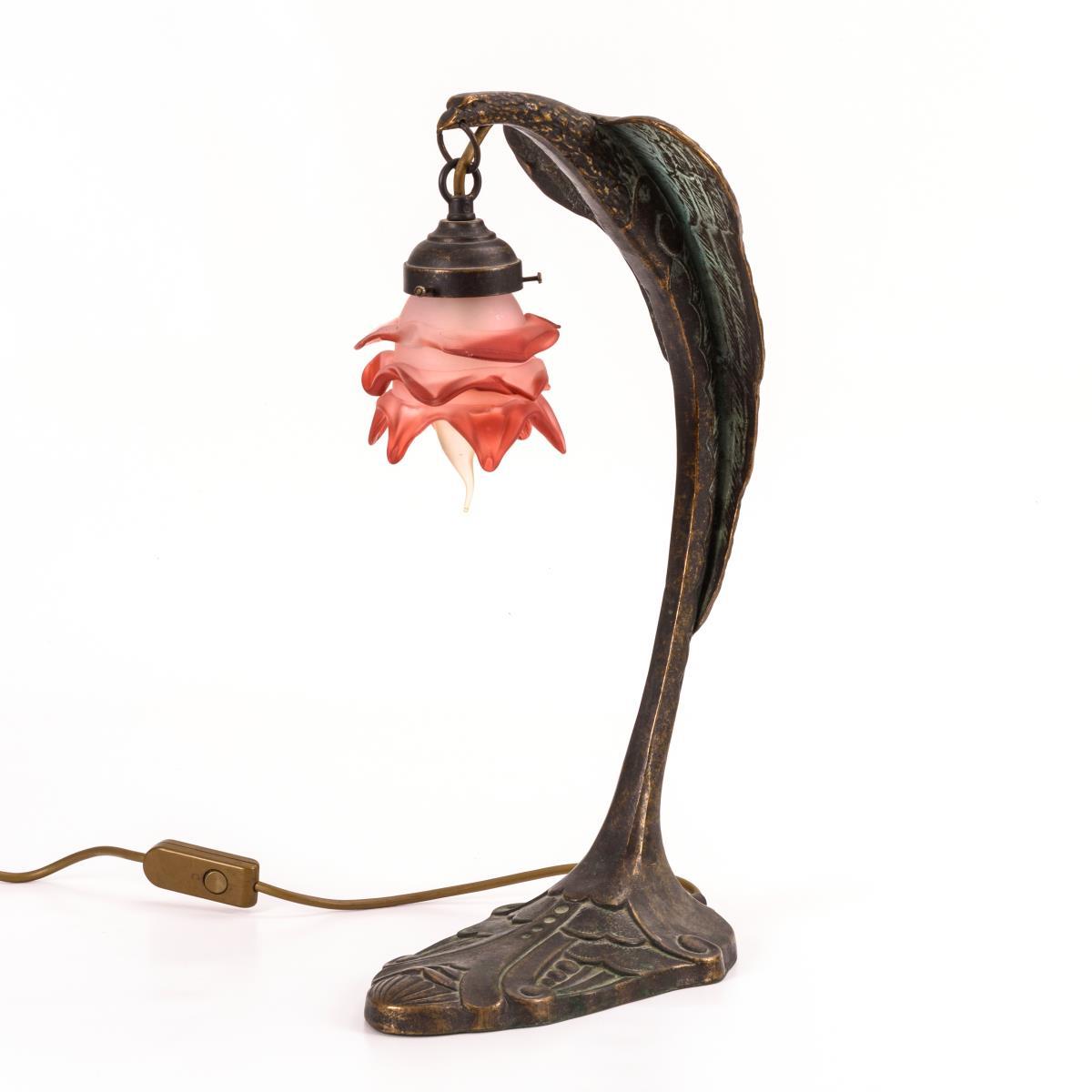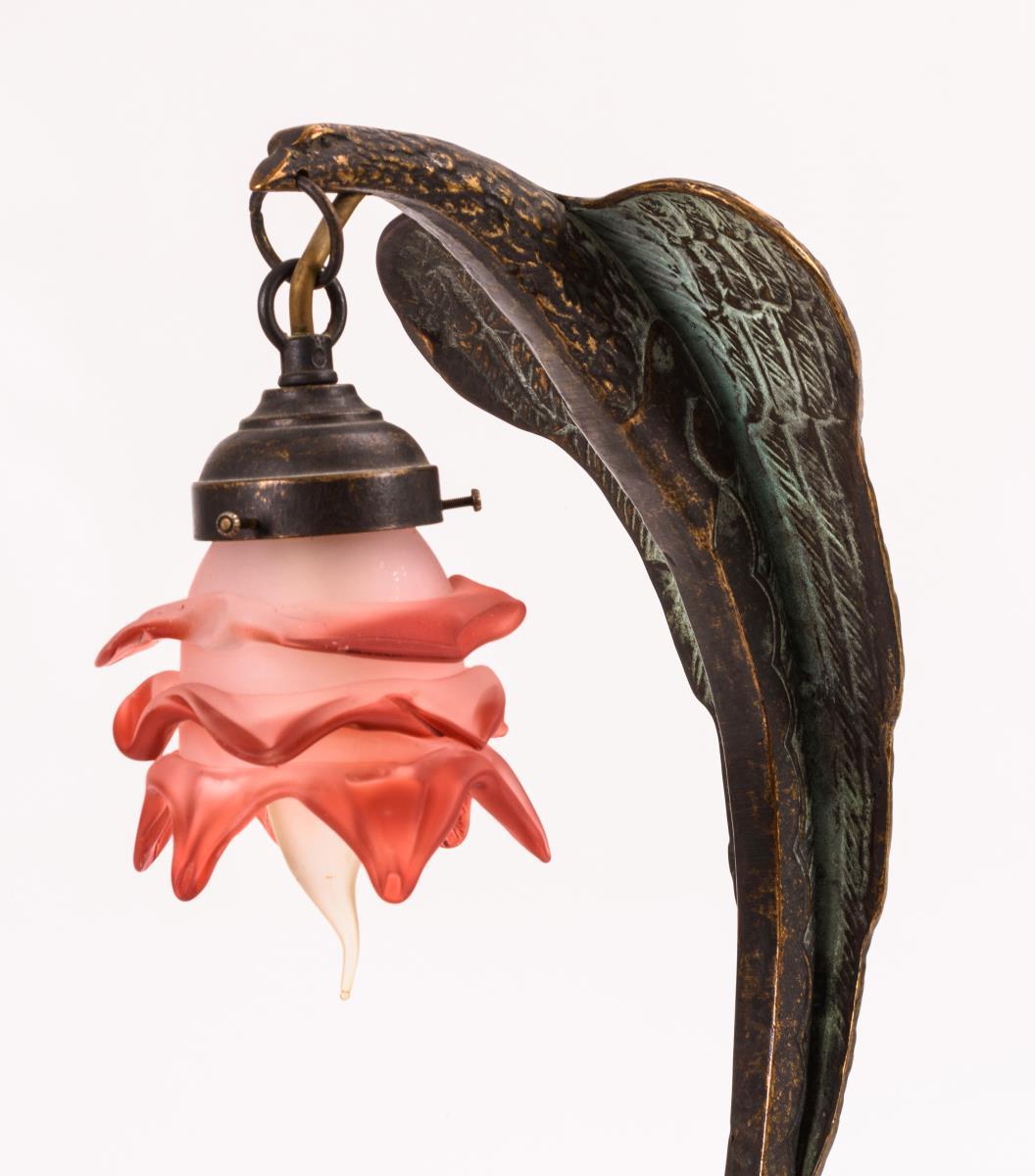 Stilisiertes Reliefornament am Fuß, bogenförmiger Schaft als stilisierter Adler, flammenförmiger Glasschirm mit 1-flammiger Schraubfassung. Etwas berieben, Verkabelung erneuert.