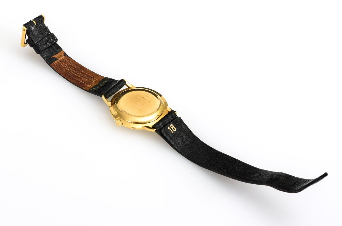 Rundes Gehäuse an schwarzem Lederband mit Dornschließe. Läuft. Minimale Gebrauchsspuren, Leder unterseitig teils gelöst.