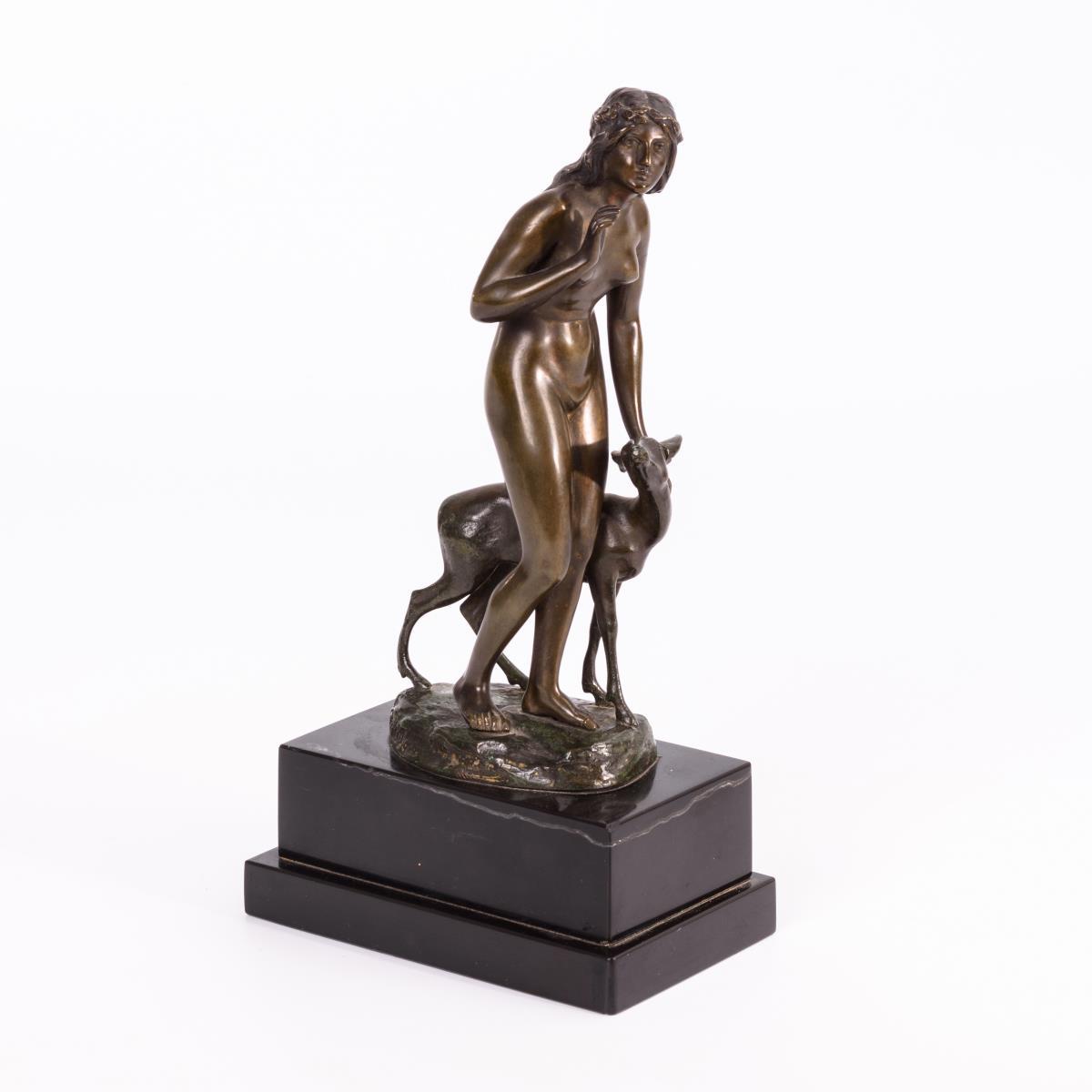 Frauenakt mit Reh. Minimale Haarrisse an den Armnähten, Sockel geklebt.