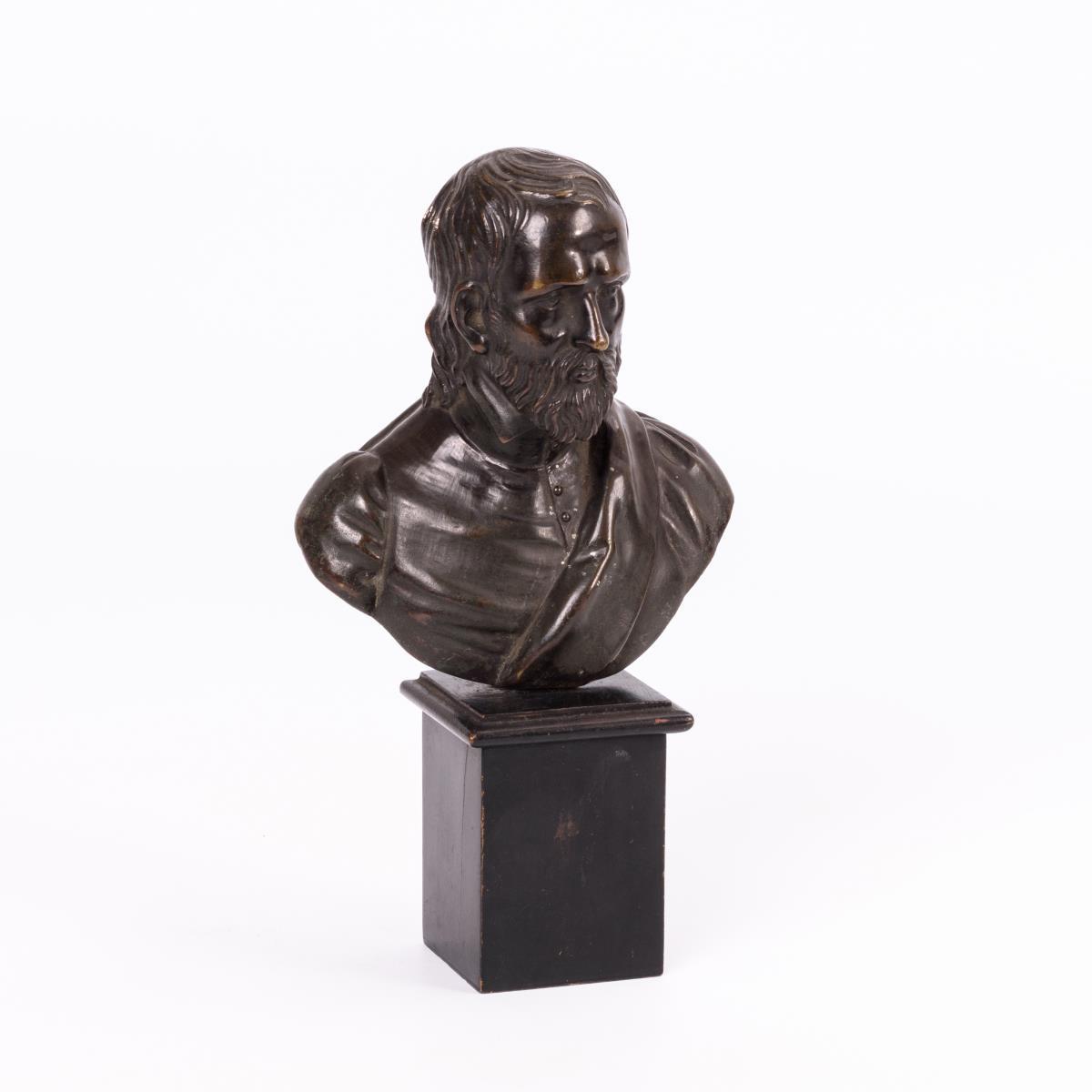 Büste eines bärtigen Mannes mit langem Haar und hohem Kragen.