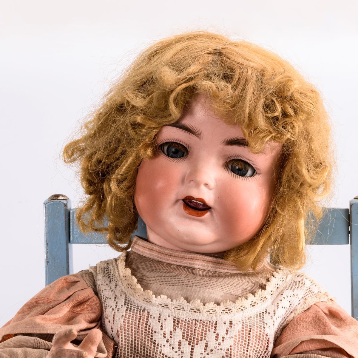 Dazu hellblaues, klappbares Hochstühlchen (H 72 cm). Leichter Perückenpull, Körper mit kleinen Lackdefekten.