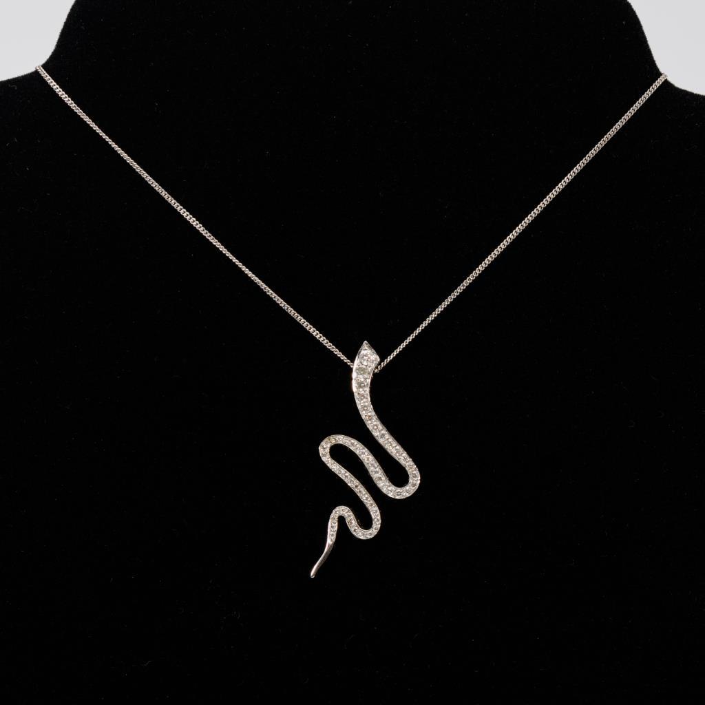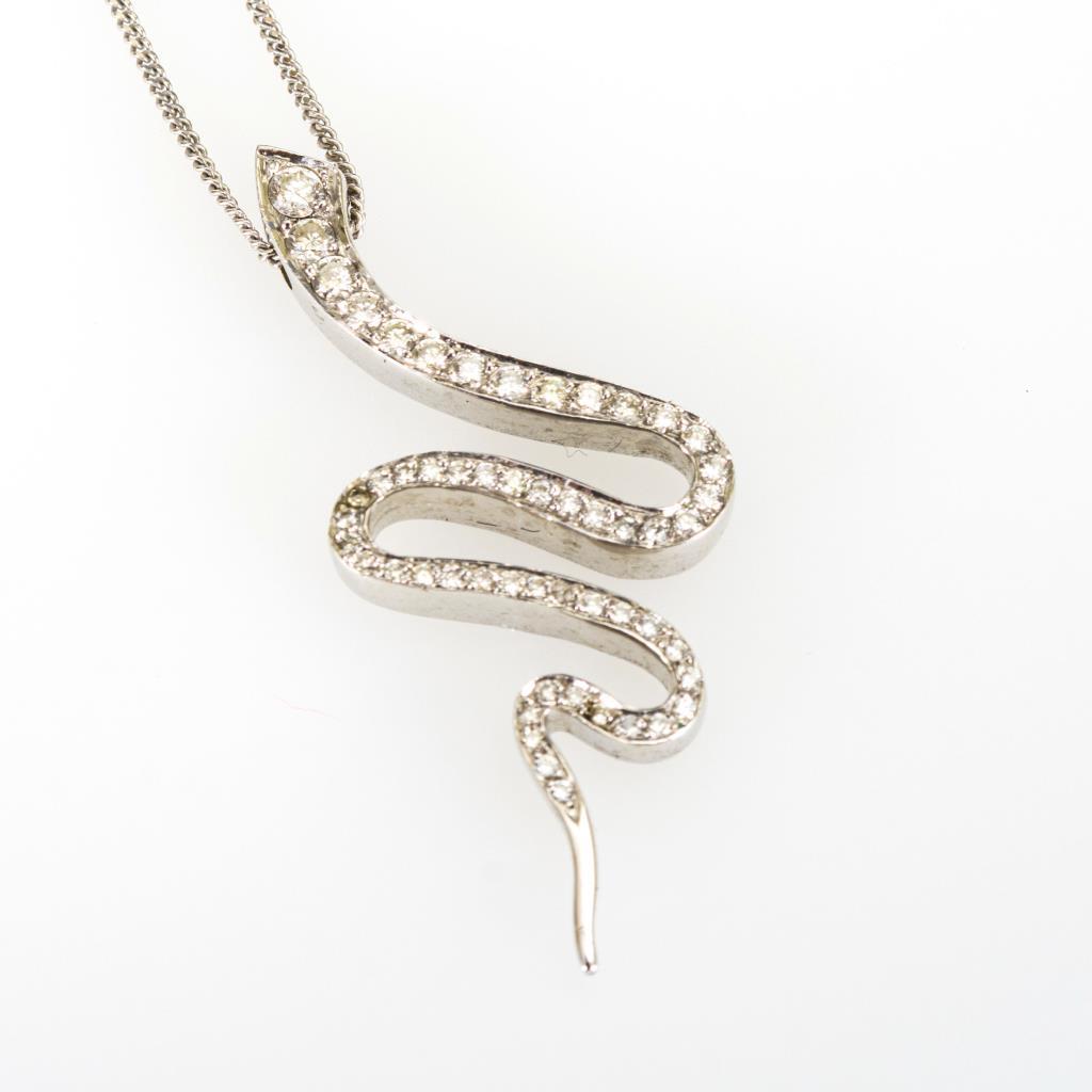 Stilisierte Schlange mit 54 Brillanten im Verlauf, an zarter Panzerkette mit Ringfederschließe.