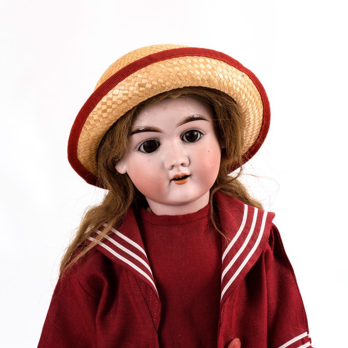 Kurbelkopf, braune Schlafaugen, offener Mund, defekte blonde Echthaarperücke. 15-teiliger Gliederkörper. Rotes Matrosenkleid, schwarze Schuhe, Strohhut. Kopf durchleuchtet: ohne Defekte, lediglich leichter Perückenpull am Hinterkopf. Körper teils überarbeitet.