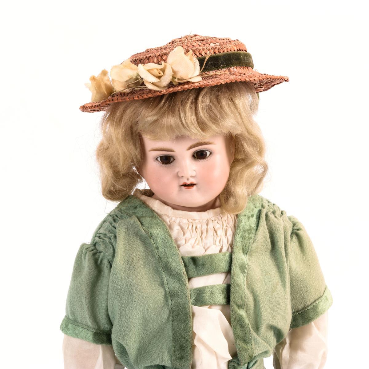Brustkopf, feste braune Augen, offener Mund, Mohairperücke. Schlanker Ziegenlederkörper mit Biskuitunterarmen und gesplinteten Beinen. Grünes Kleid, Gürteltäschchen, Strohhut. Kopf durchleuchtet: ohne Defekte. Linker Daumen fehlt.