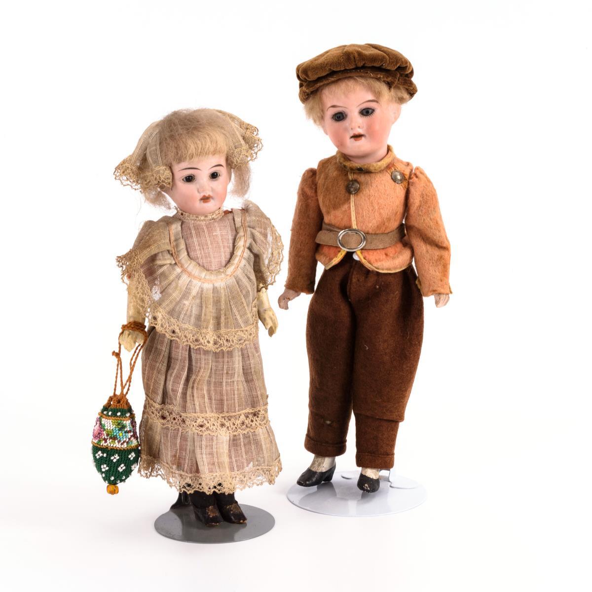 Beide mit Kurbelkopf, festen Glasaugen und blonder Mohaiperücke. Jeweils 5-teiliger Stehpuppenkörper. Knabe in brauner Filzkleidung, Mädchen in hellem Kleid. Altersspuren, Mädchen mit kurzem Brandriss an der Kopfkurbel.