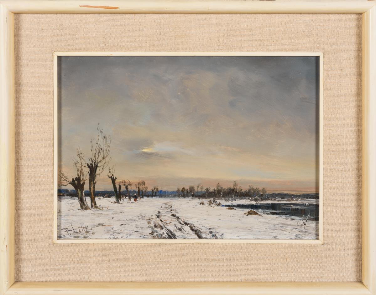 Weite flache Landschaft mit Kopfweiden im Schnee an einem Gewässer.