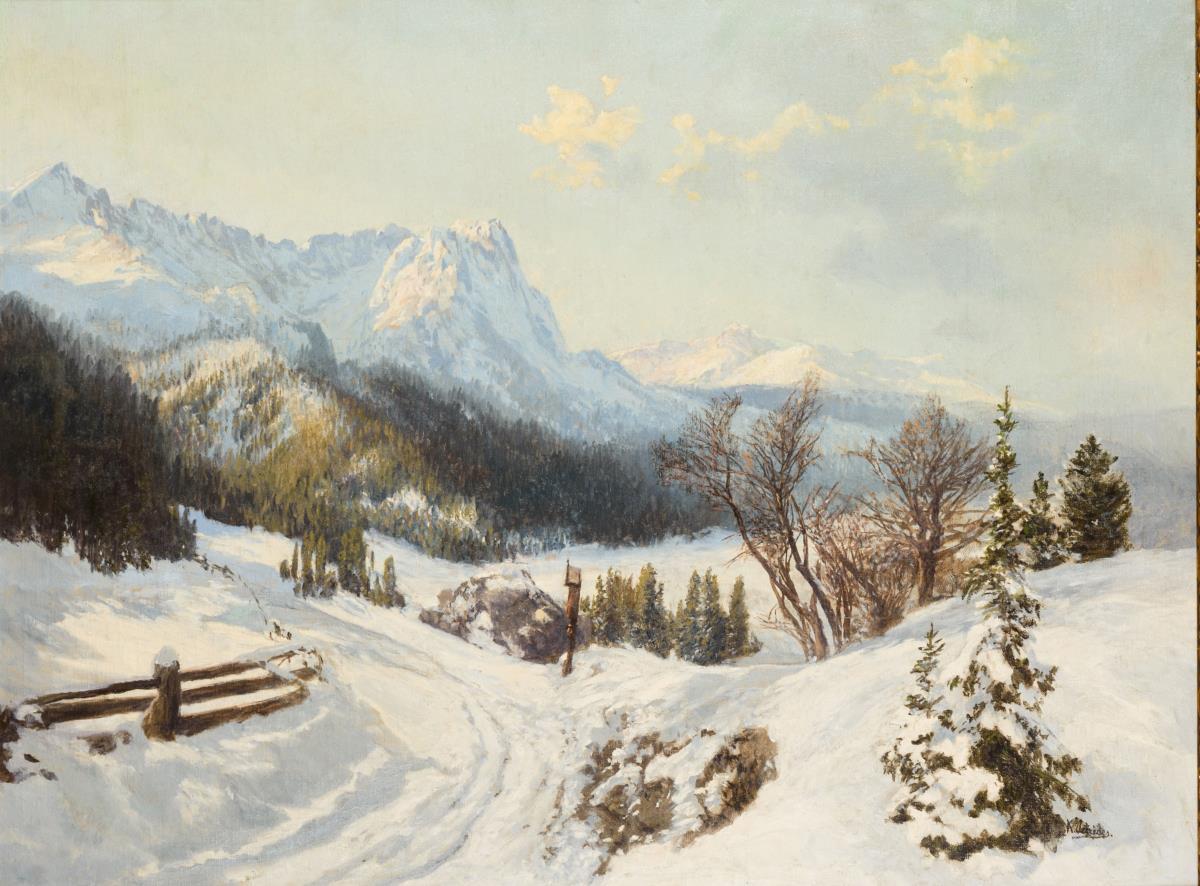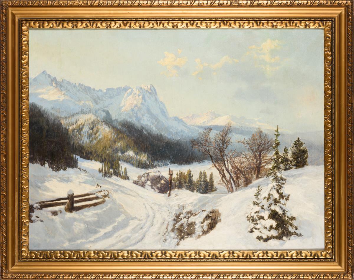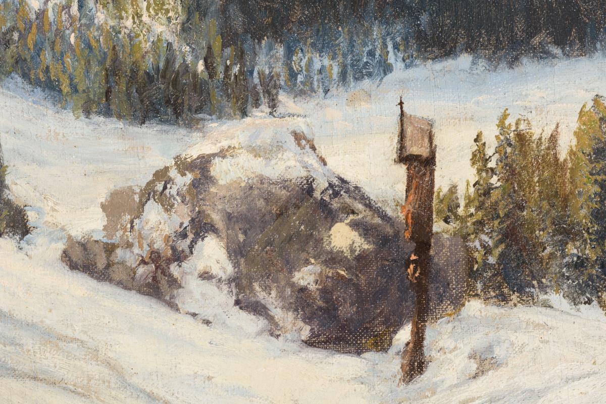 Sonnige Winterlandschaft mit Wegkreuz an verschneitem Pfad vor den Gipfeln. Restauriert.