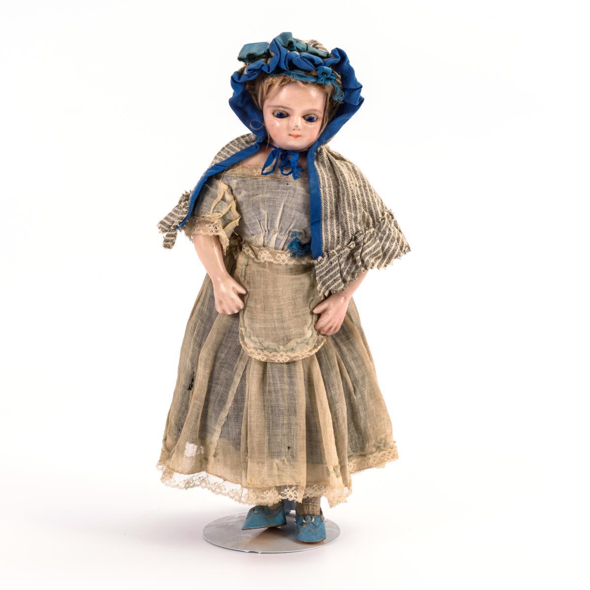 Wachsierter Brustkopf, drahtbewegte blaue Schlafaugen, geschlossener Mund, defekte blonde Mohairperücke. Stoffkörper mit wachsierten Dreiviertelarmen und -beinen. Alte Originalkleidung mit weißem Kleid , Kapuzencape und blauen Wachstuchschuhen. Altersspuren, Haarriss am linken Augenwinkel, Augenmechanismus intakt.