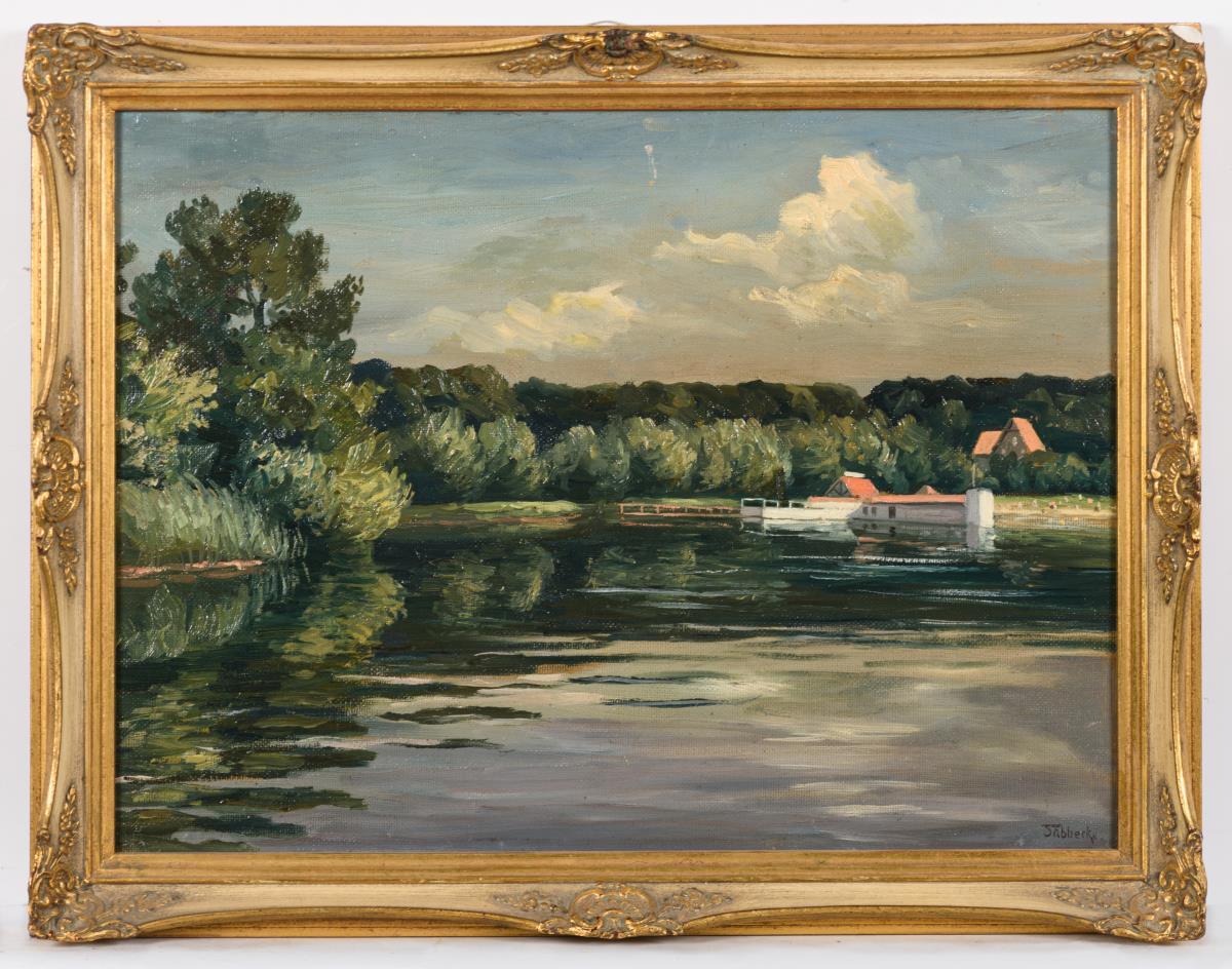 Sonniger Seeblick mit Gebäuden am Ufer vor dem Wald. Minimale Altersspuren.