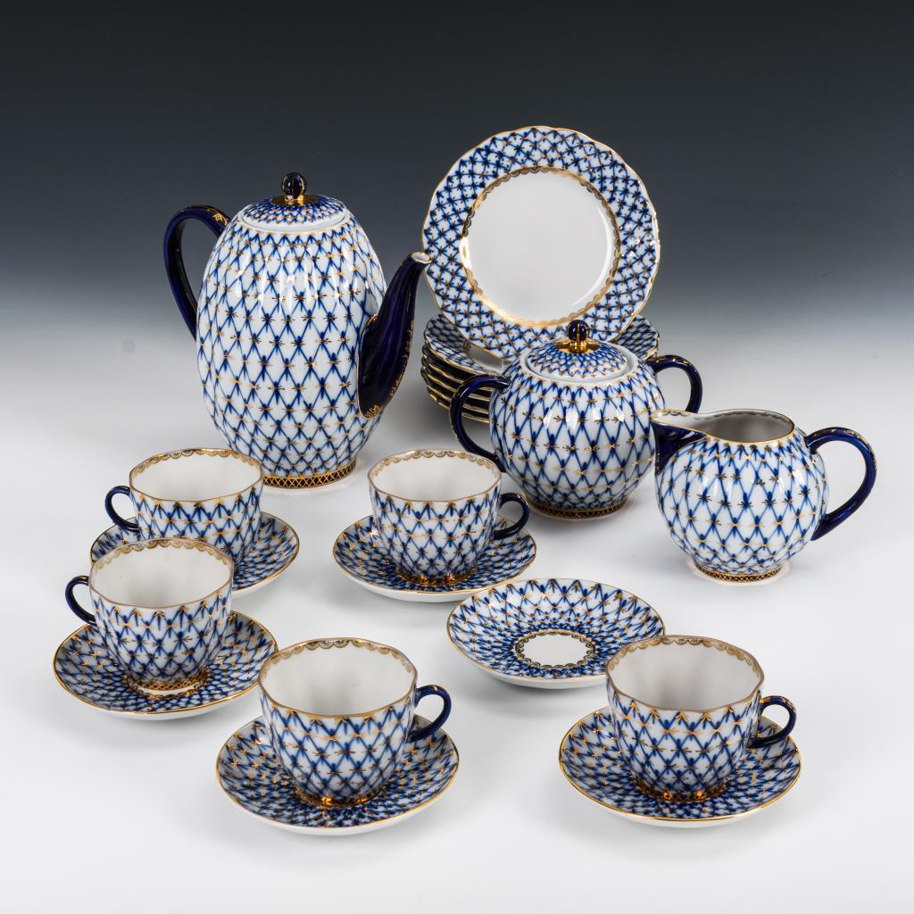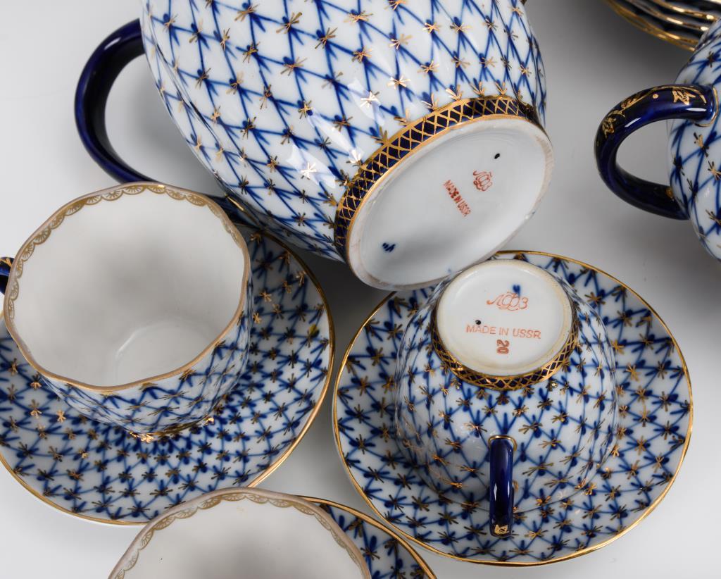 Unterglasurblaues, goldstaffiertes Dekor "Kobaltnetz".