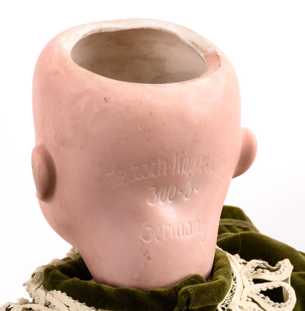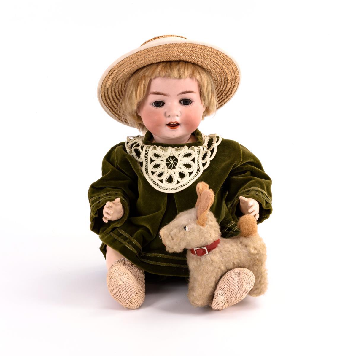 Kurbelkopf, blaue Schlafaugen, offener Mund, Zunge, blonde Mohairperücke. 5-teiliger Sitzbabykörper. Grüner Samtanzug mit weißem Kragen, Strohhut. Dazu kleiner, weißer Hund. Kopf durchleuchtet: ohne Defekte, lediglich 2 winzige Chips an der Halskurbel, 1 Zahn ergänzt, Zunge übermalt.