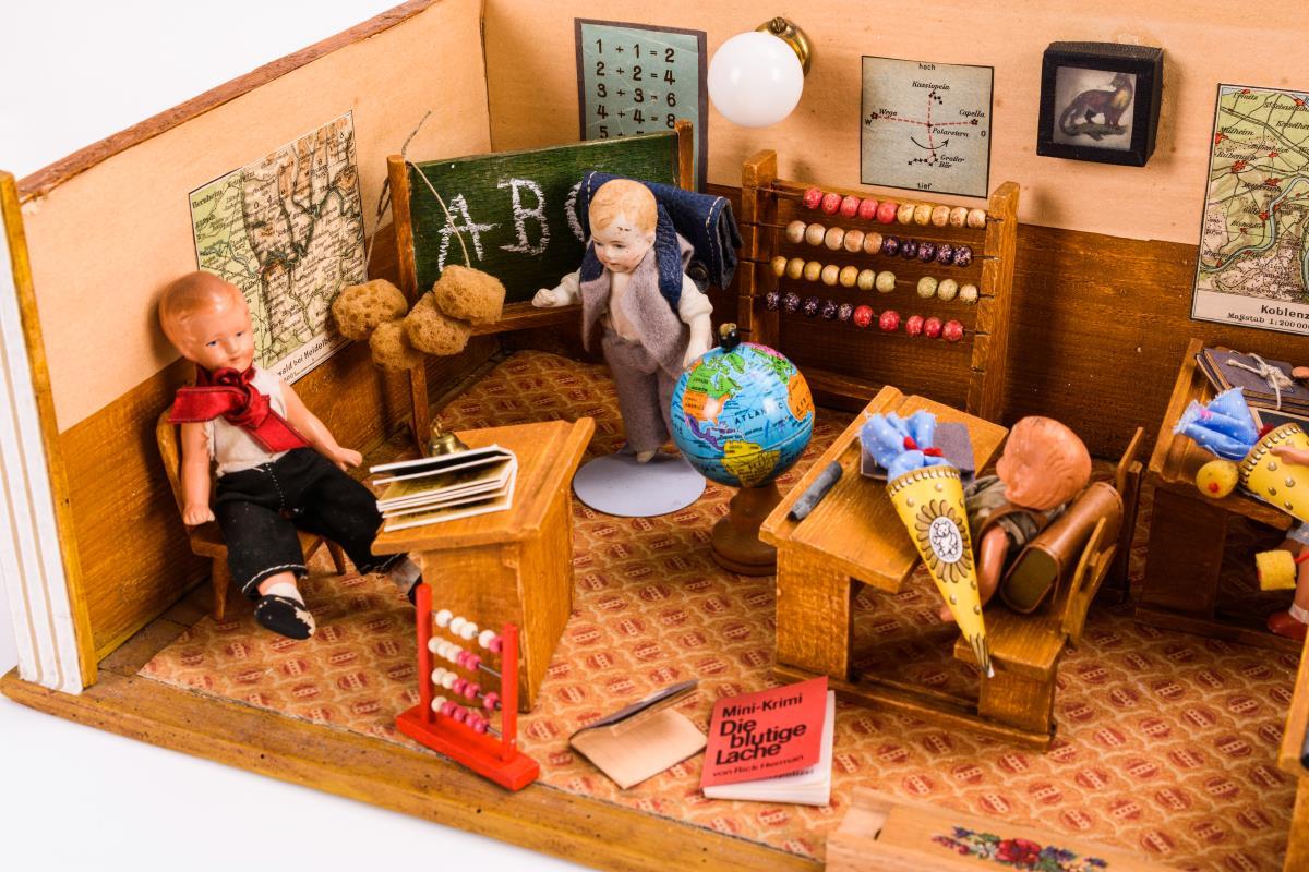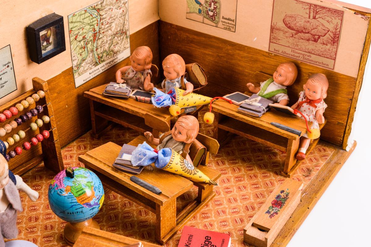 1-Raum-Gehäuse, als Schule eingerichtet. Mit Tafel, Lehrerpult, Rechenschieber und 3 Schulbänken, Wände mit Landkarten beklebt. Dazu 7 Püppchen, Hefte, 2 Zuckertüten etc. Mit 2 losen Glasscheiben. Altersspuren, jünger elektrifiziert, Funktion nicht geprüft.