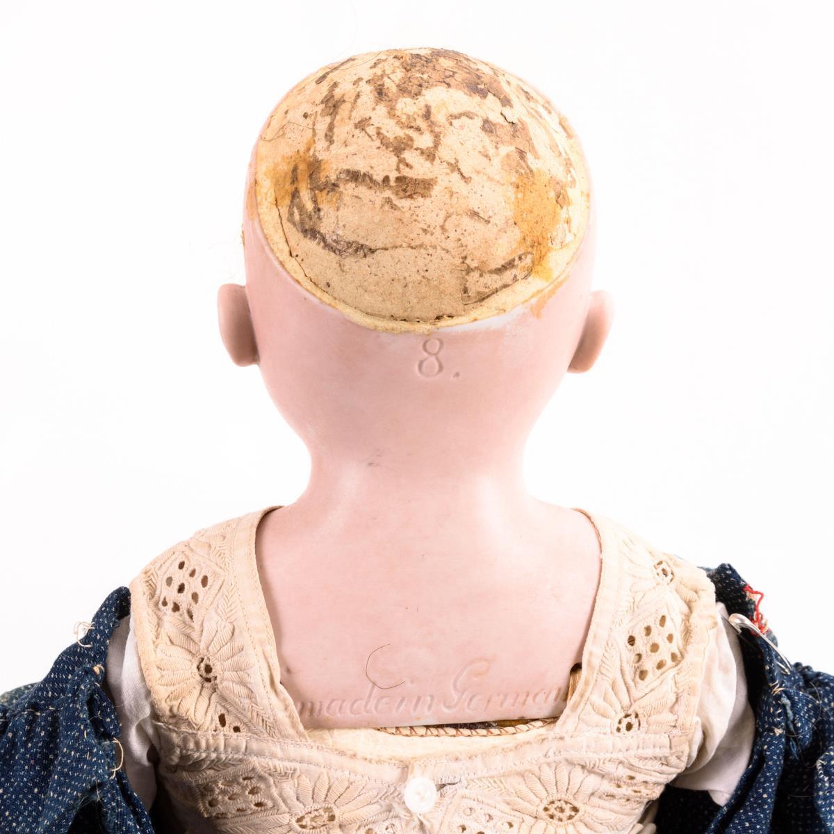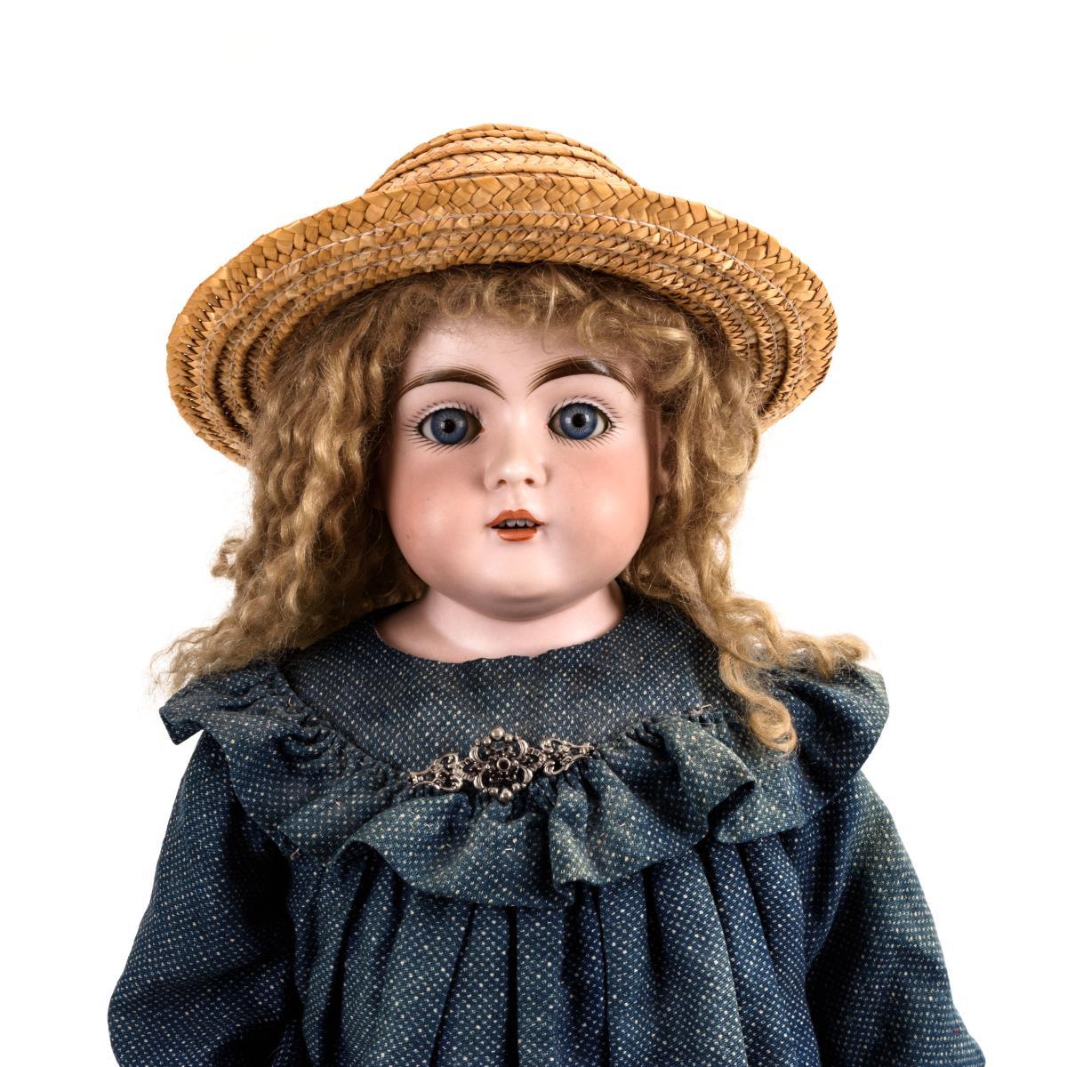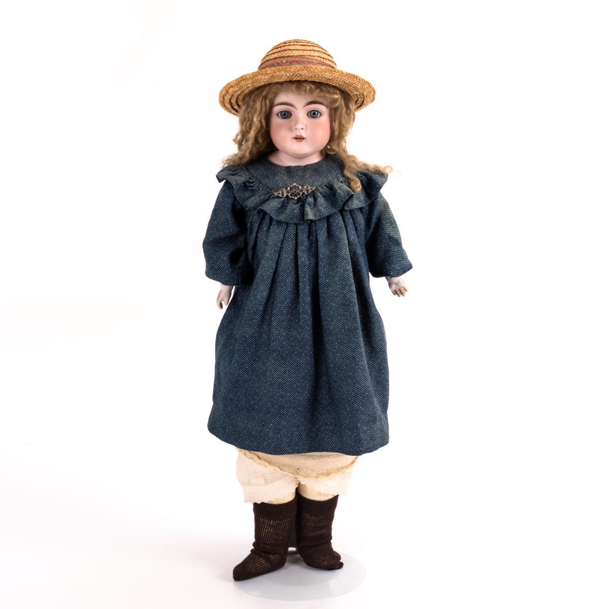 Blaue Schlafaugen, offener Mund, gelockte Mohairperücke. Lederkörper mit gesplinteten Beinen und Kniezwickeln. Alte Unterwäsche, blaues Kleid, braune Strümpfe, Strohhut. Kopf mit festgegipstem Deckel: ohne sichtbare Defekte. Arme möglicherweise ergänzt.
