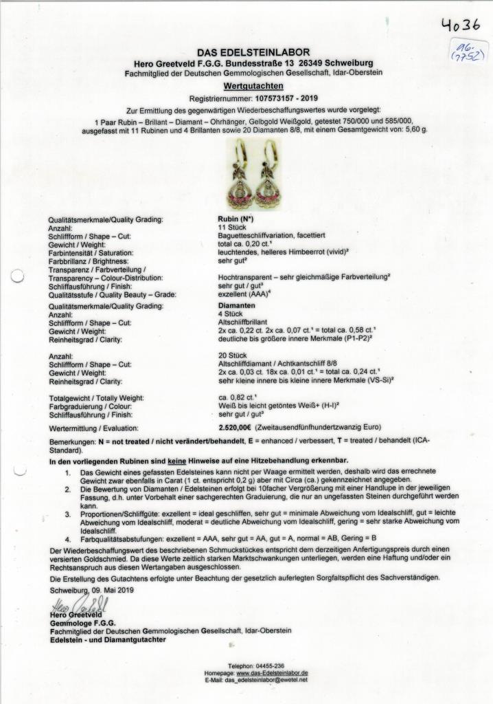Tropfenförmige Millegriffes-Abhängung, besetzt mit je 5 Rubincarrés, 2 Brillanten und 10 Diamanten. Federbügel.